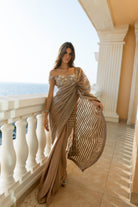 Un sari finamente estructurado con drapeado en los hombros listo para usar combinado con un top adornado. Combinando elegancia y artesanía, llamarás la atención cuando entres en la habitación de esta obra maestra atemporal.