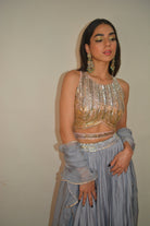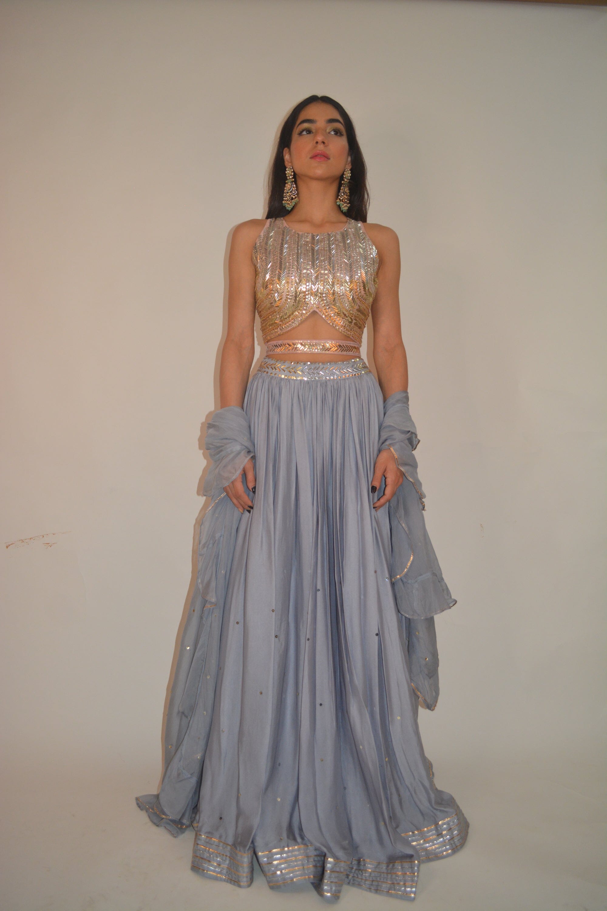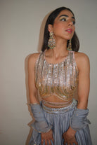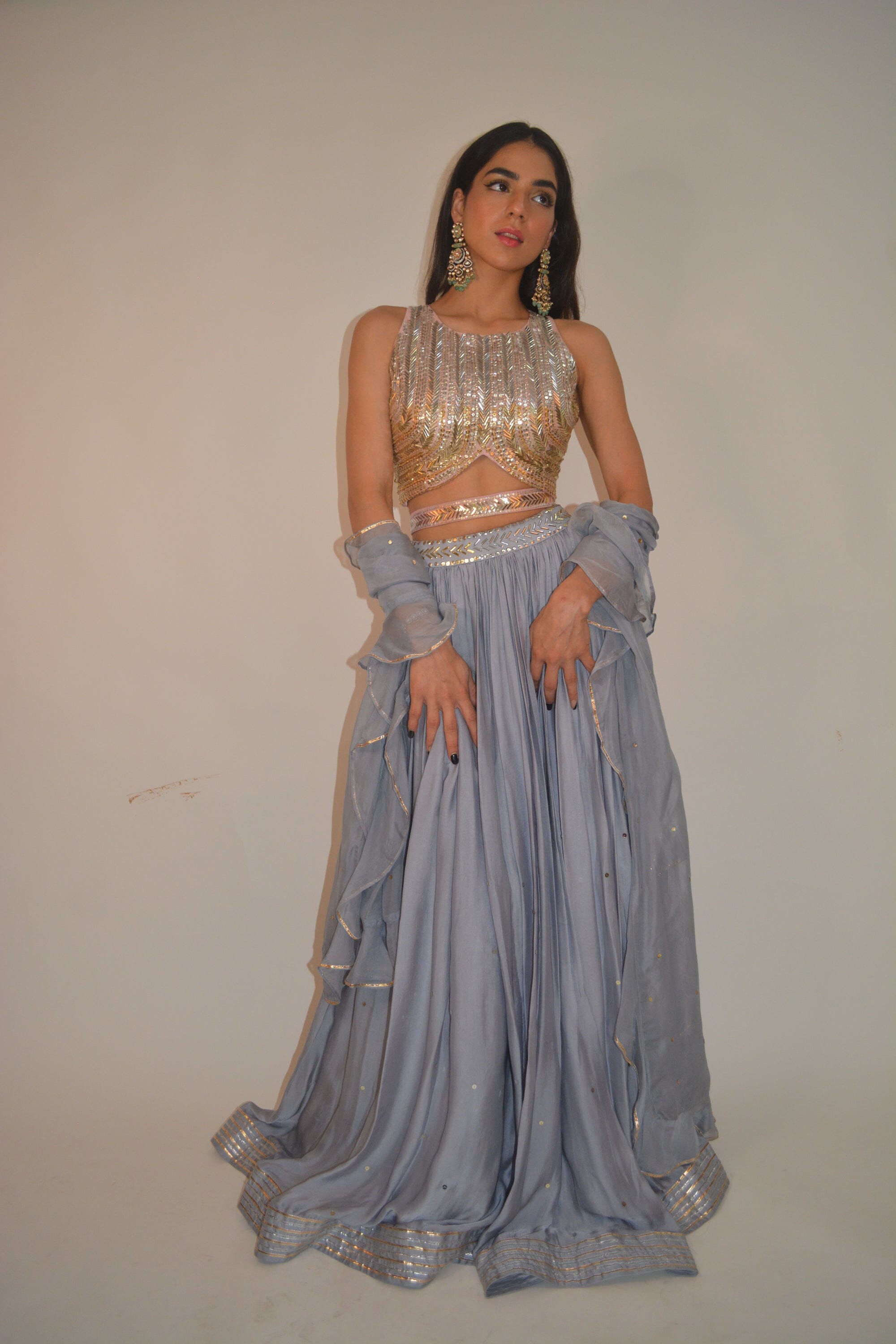 Un top conceptual ajustado combinado con una falda acampanada en contraste y una dupatta con volantes, decorada con un cinturón was it.