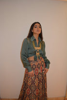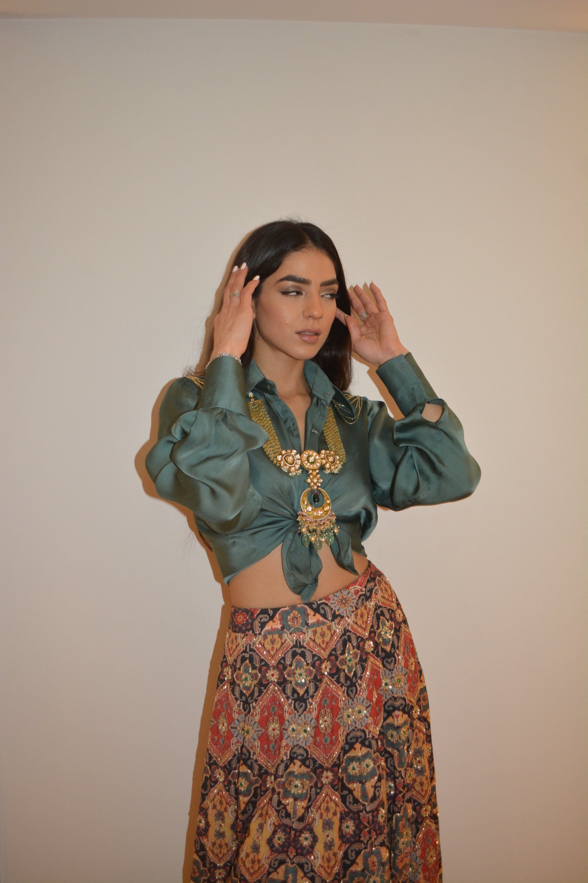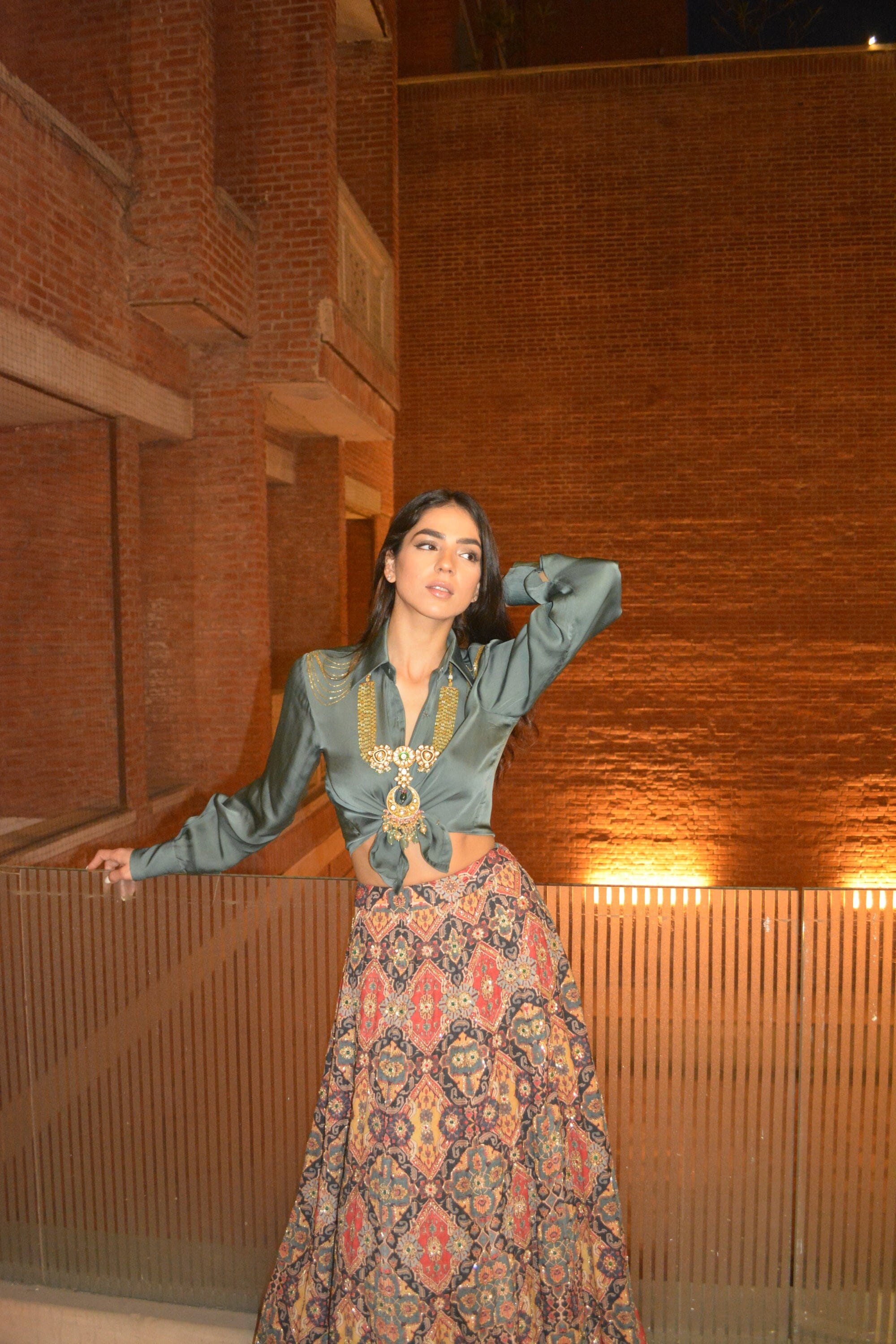 Una camisa con cuello combinada con una falda estampada con muchos bordados. El collar y las cadenas van unidos a la camisa.