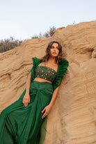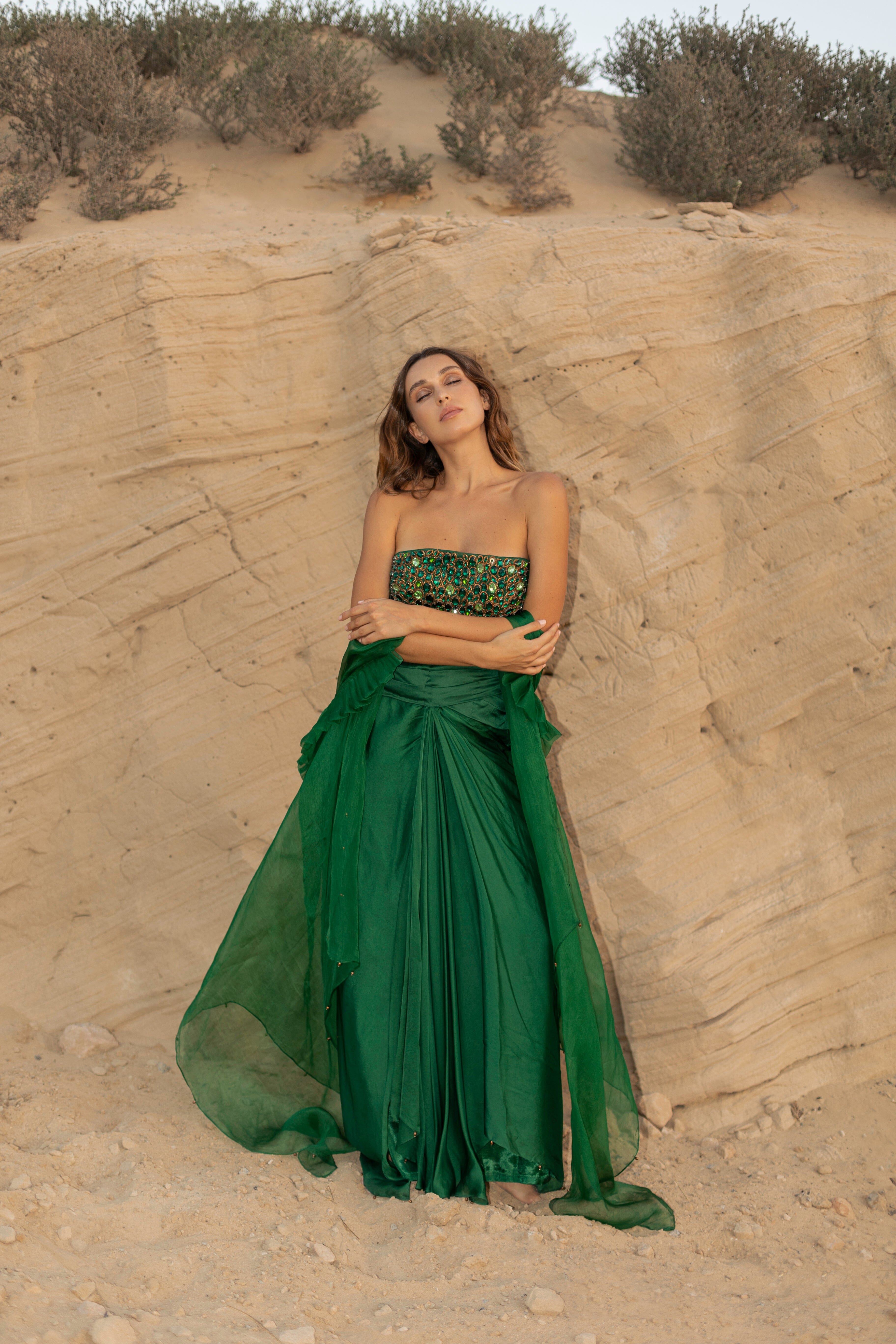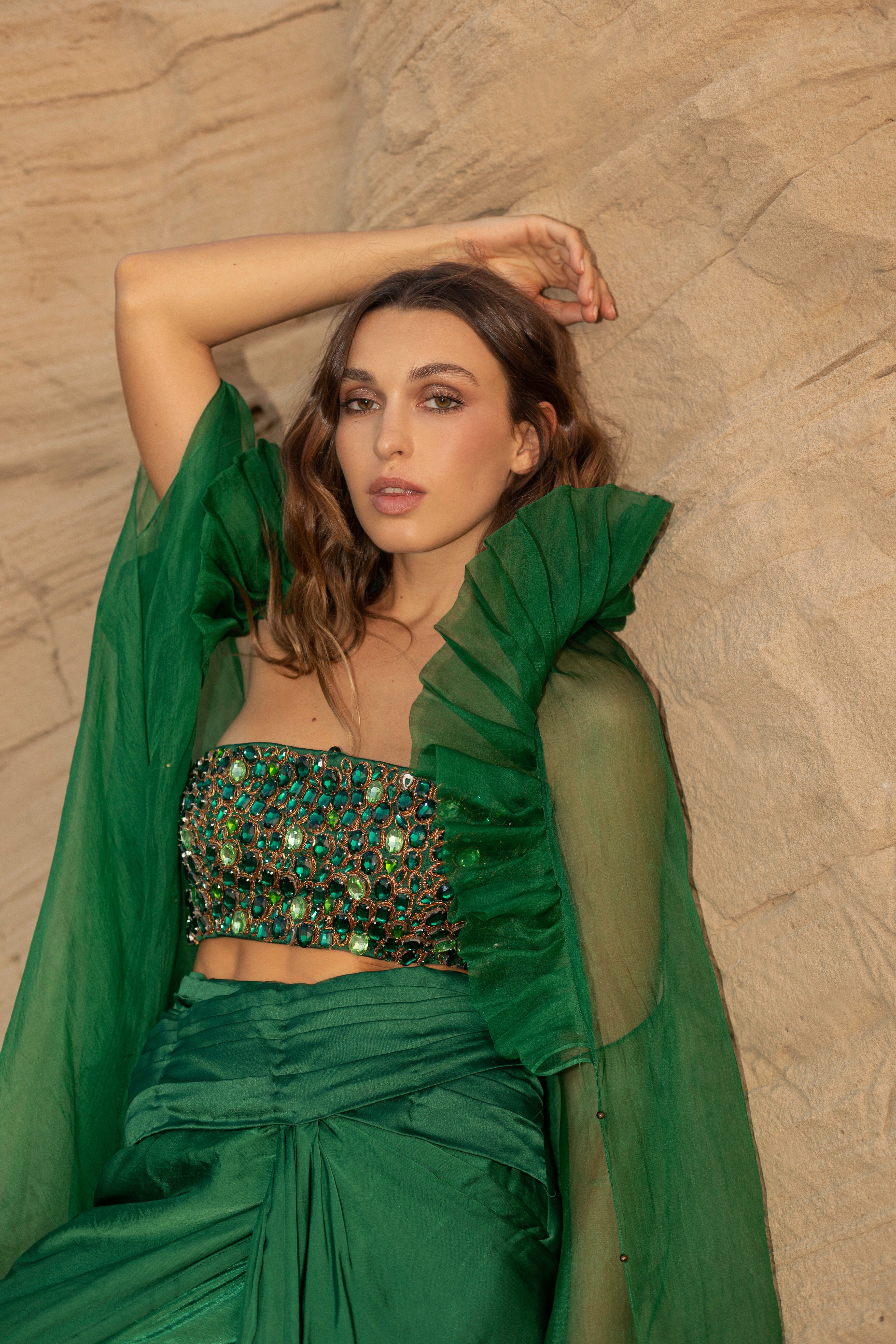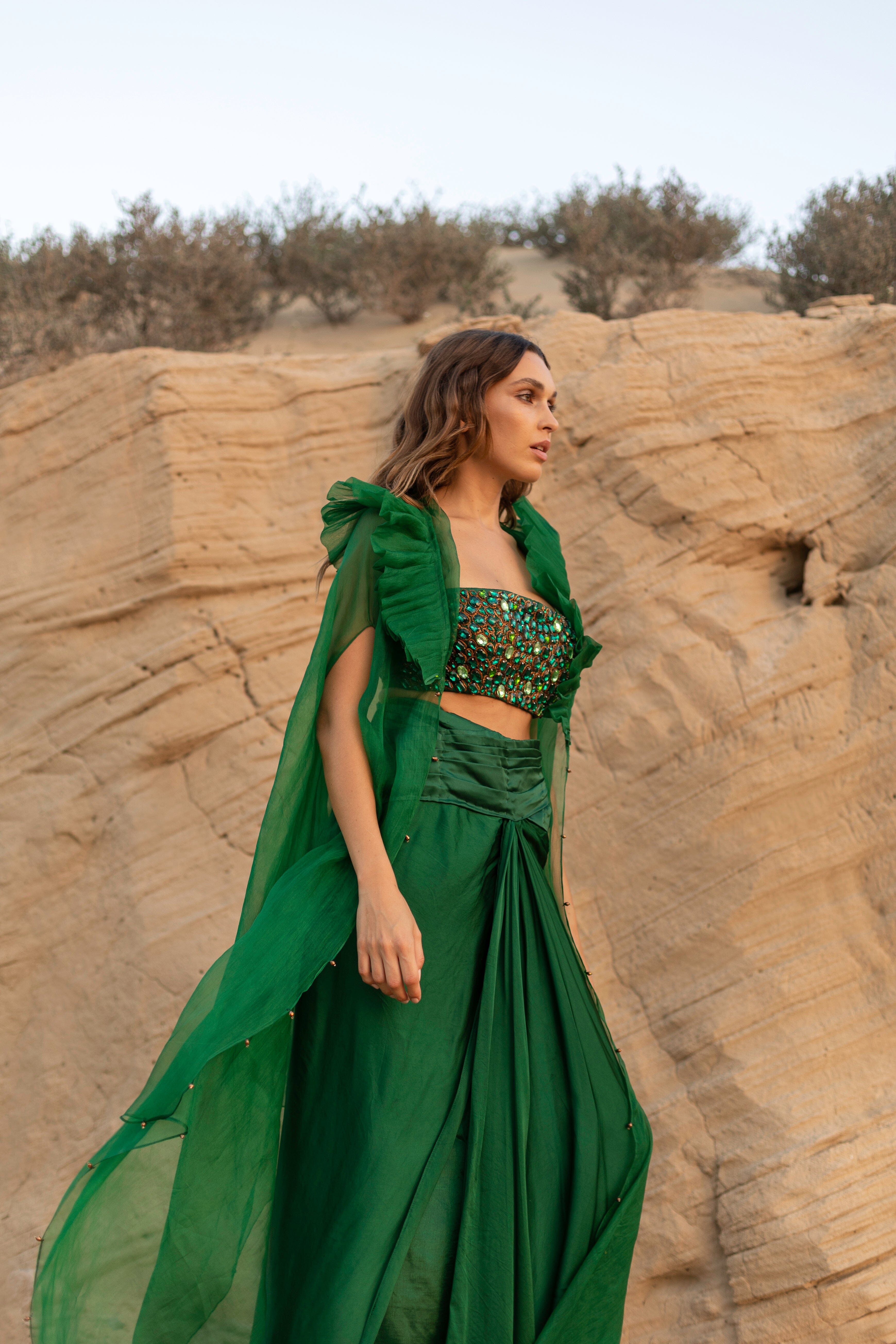 Un top llamativo completamente adornado combinado con una falda esculpida y una capa. Un conjunto sencillo para un look inolvidable. Su tejido ligero y transpirable permite una comodidad y estilo impecables.