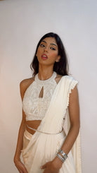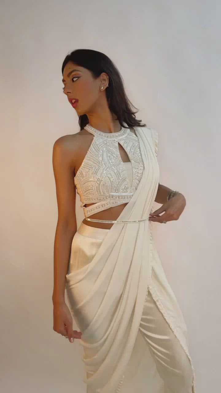 Un pantalón sari elegante y listo para usar con cuello halter y un cinturón elegante. La blusa Halter está cubierta de lentejuelas.