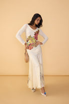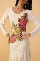 Abstract Print Maxi Dress With Long Sleeves, Fitted Bodice And Cowl Neckline