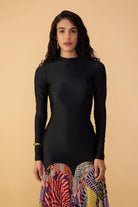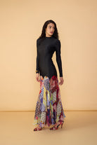 Abstract floral print closed neck maxi dress with long sleeves and fitted bodice