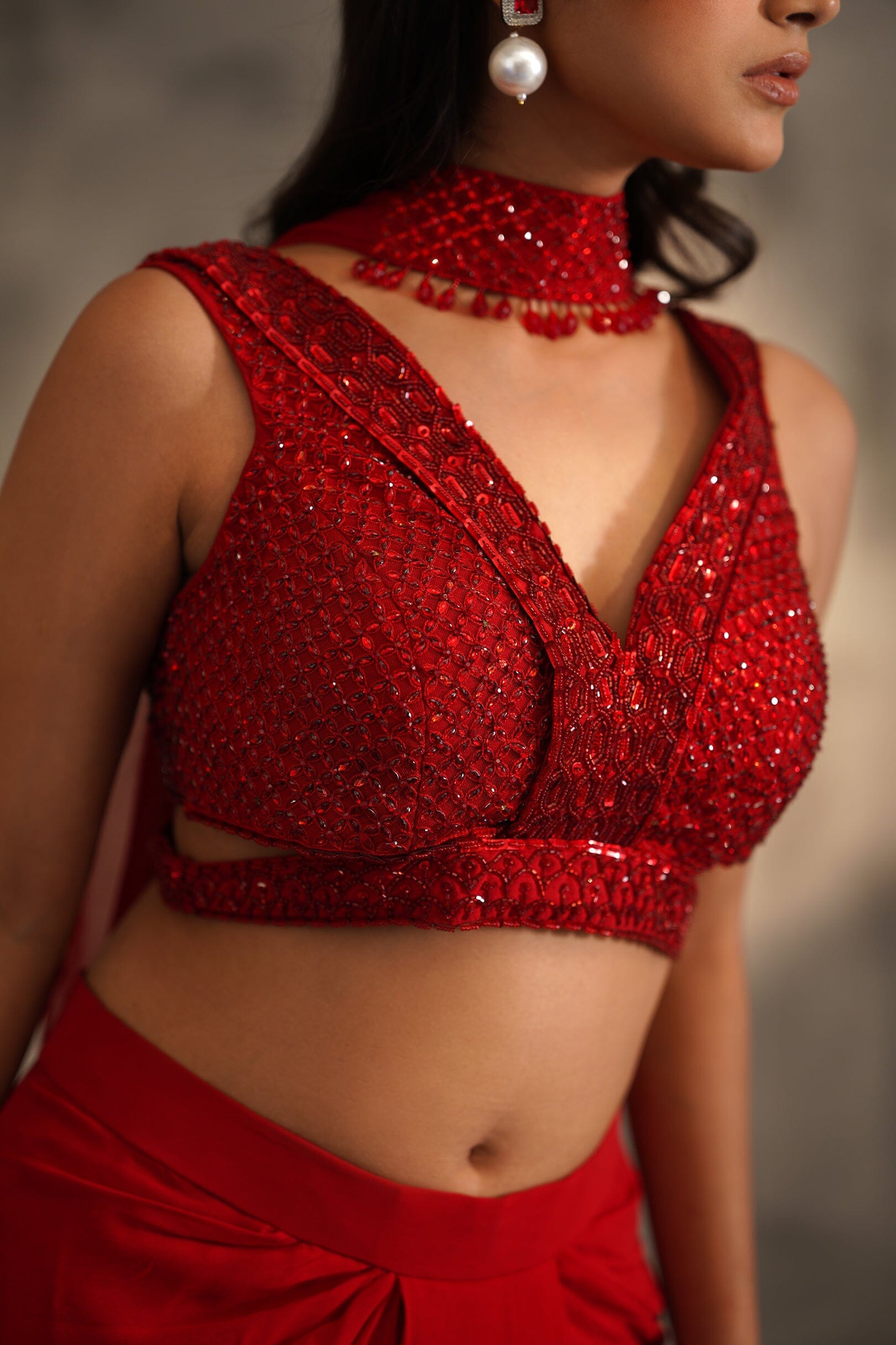 Red Embroidered Blouse, Dhoti Skirt and Choker Dupatta