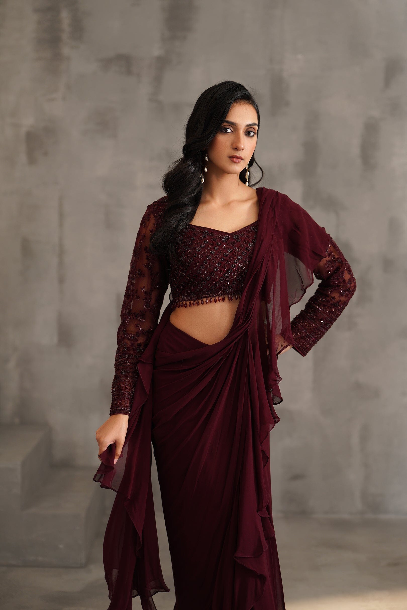 Wine Embroidered Blouse and Draped Ruffle Saree