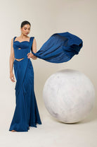 Command the spotlight in our Teal Corset Saree — a sculpted silhouette that marries structure with fluidity. Designed in luxurious fabric, the corset contours the body with precision, while the pre-draped saree cascades effortlessly for a modern, yet timeless appeal. With refined gathers and a cinched waistline, this ensemble is your go-to for elevated celebrations and unforgettable entrances.