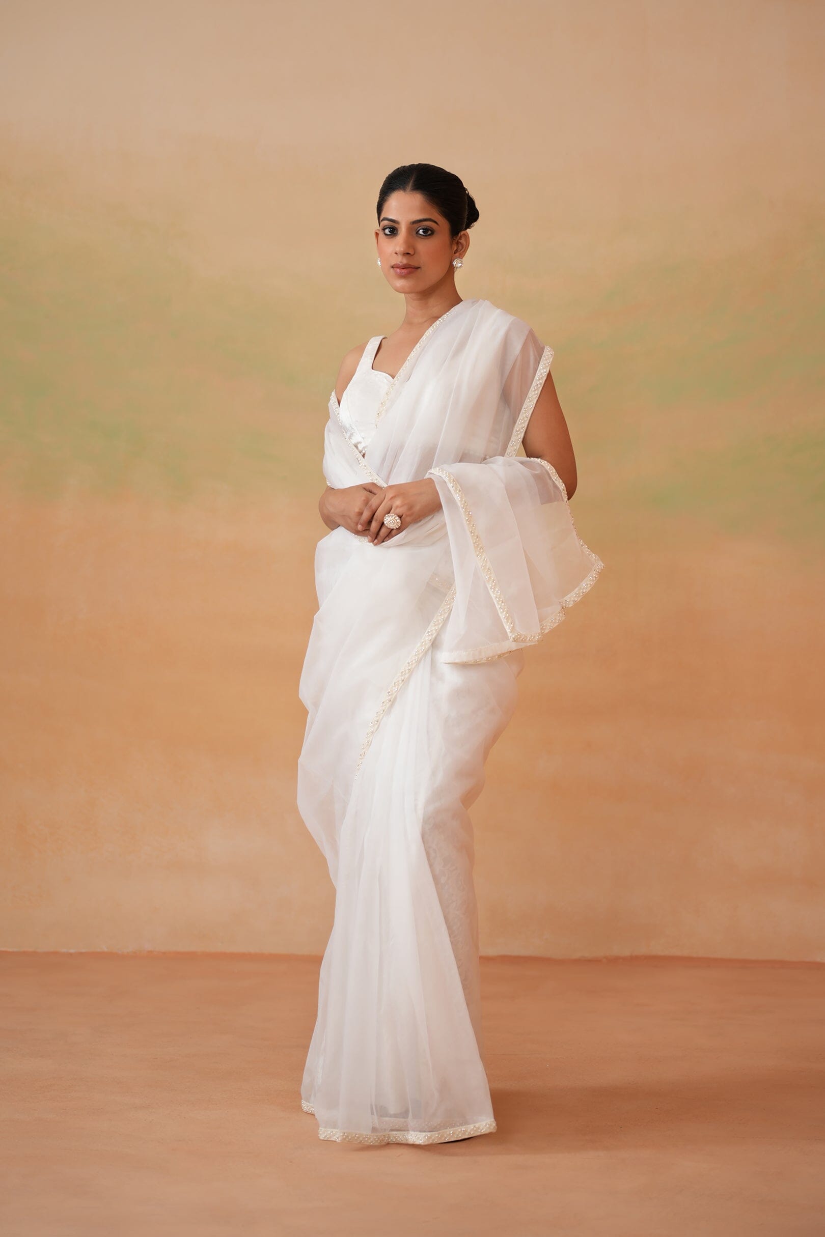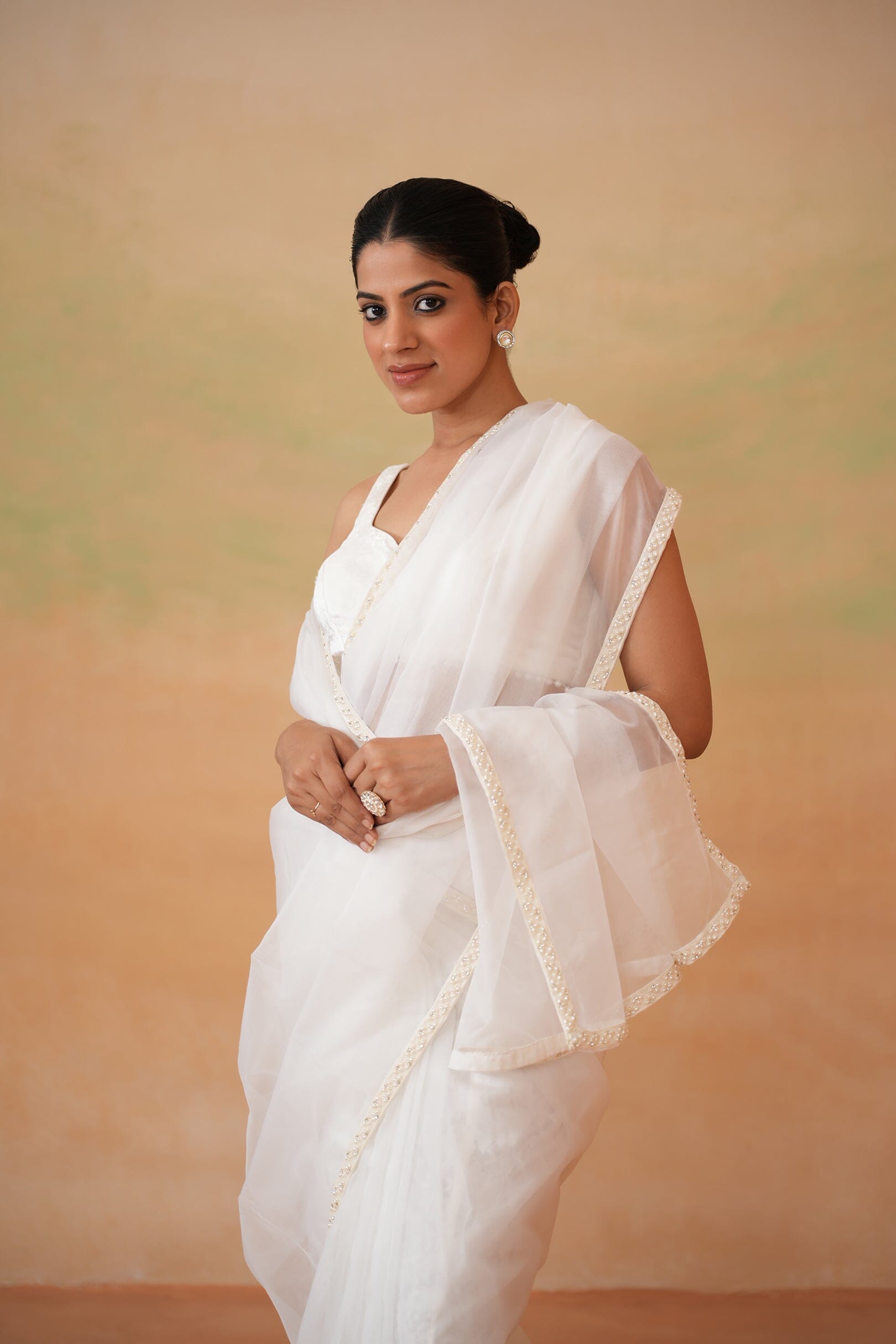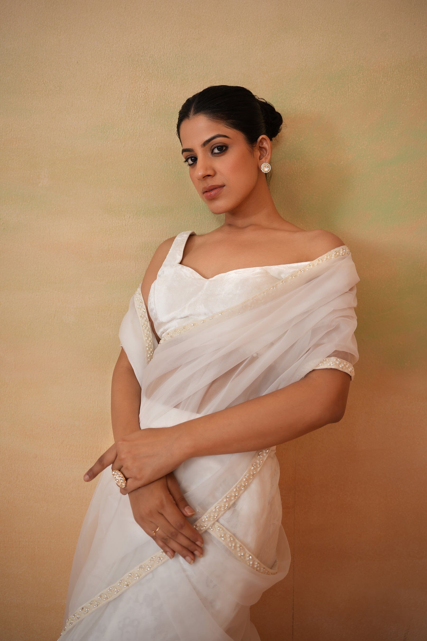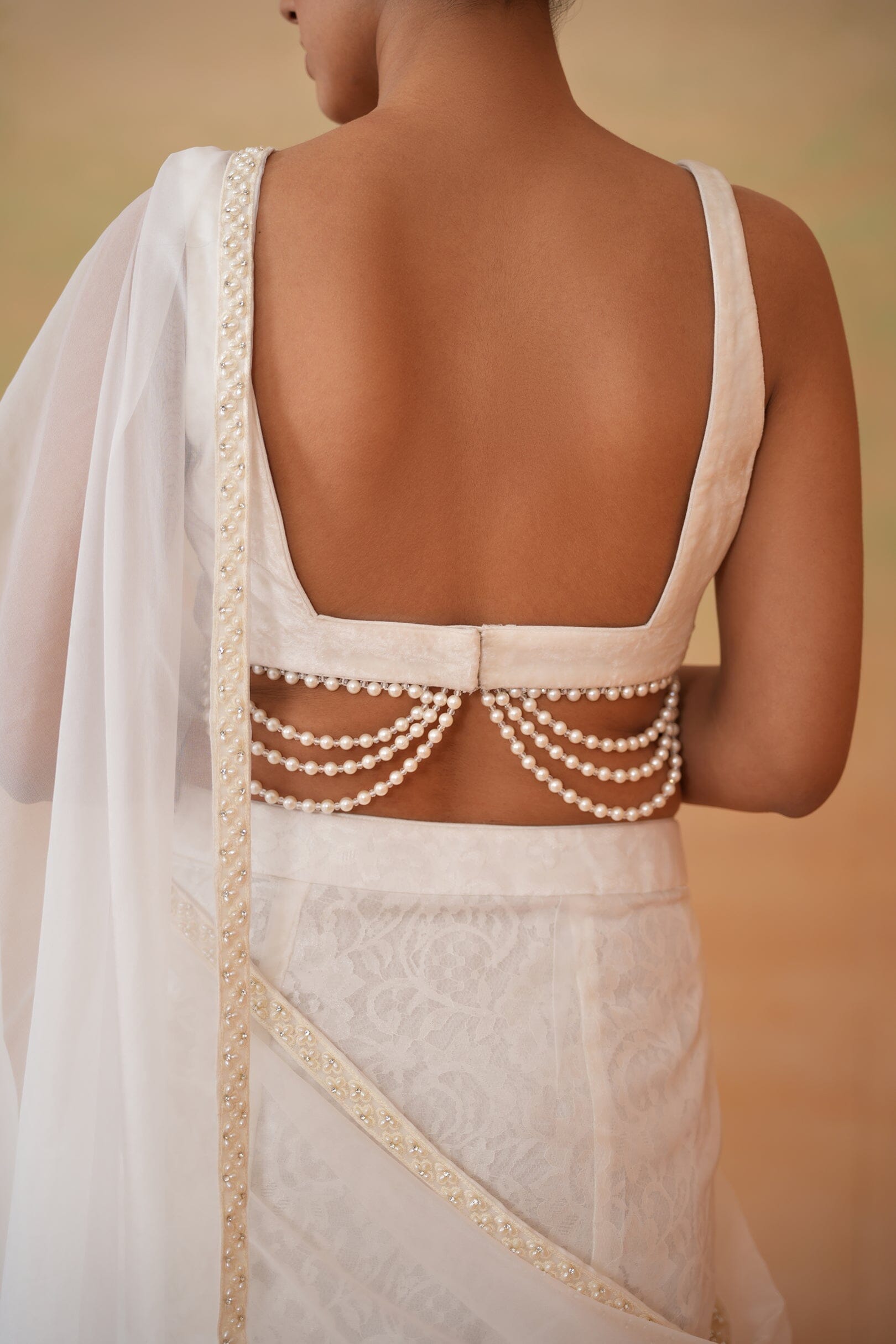 Deepika Chadha's stunning Off white velvet blouse beautifully adorned with pearls design at back. The flowy Organza stitched saree with Shand lace attached petticoat, beautifully adorned with Pearl border all around which gives you a sophisticated look and is perfect for wedding and festive season.