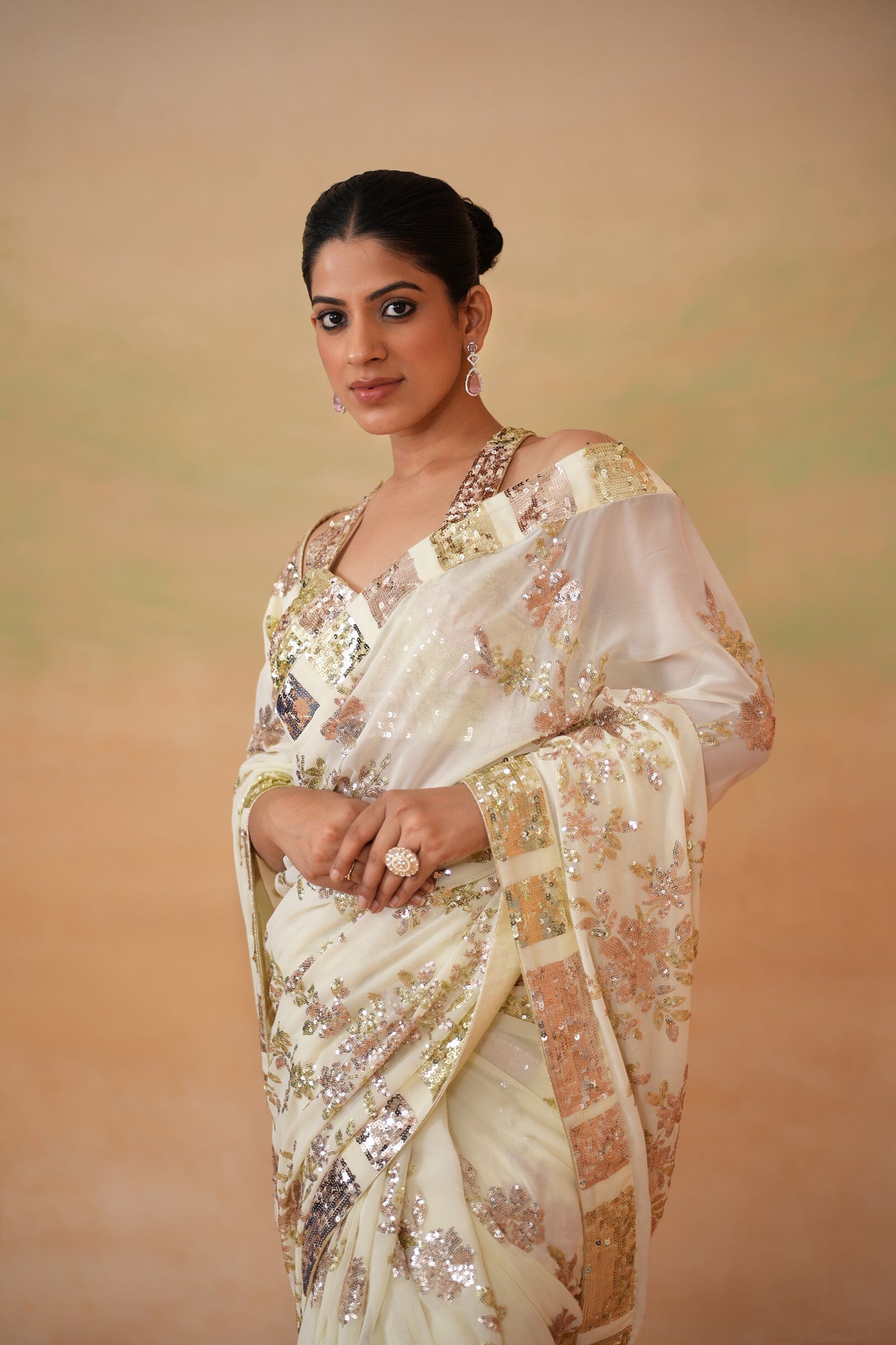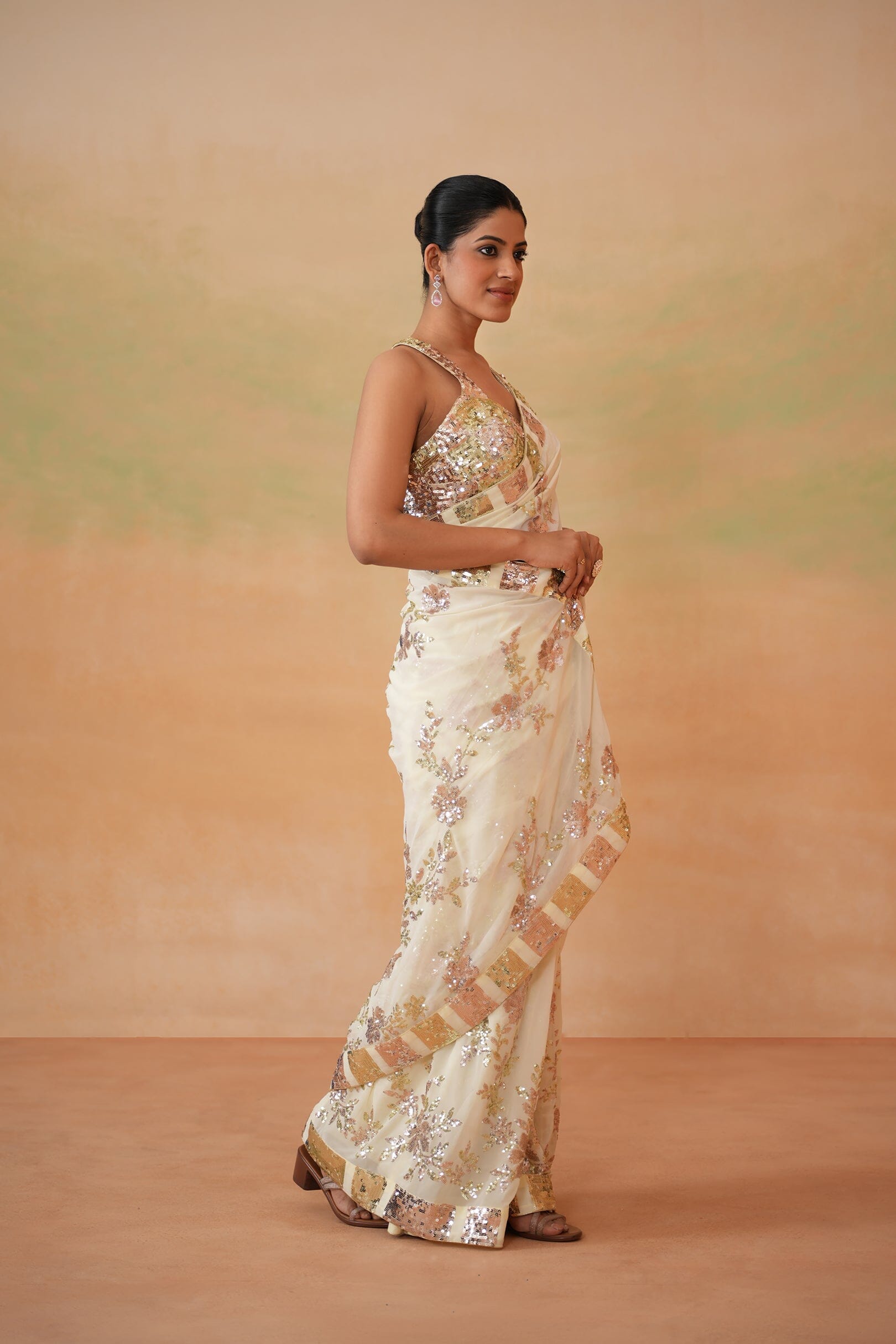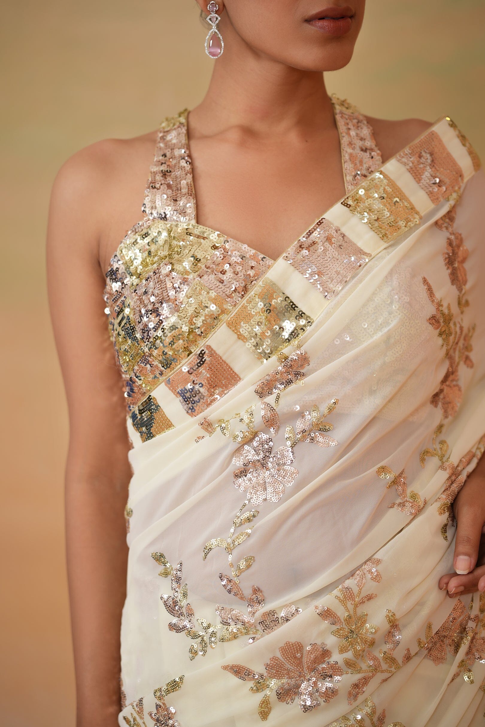 Deepika Chadha's stunning Lime yellow georgette embroidered fabric blouse beautifully adorned with intricate sequins embroidery. The flowy Georgette stitched saree with beautiful borders and embroidery all over is perfect for wedding and festive season.