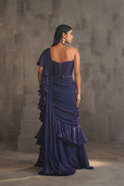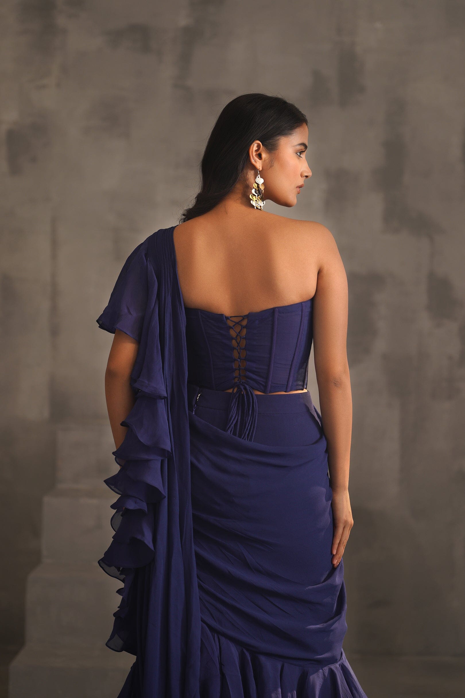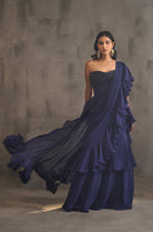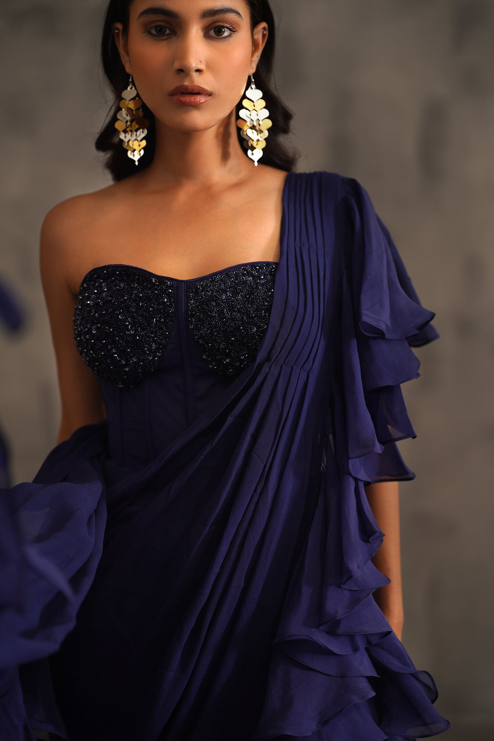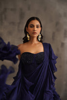 Deepika Chadha's stunning Navy blue Organza corset beautifully adorned with intricate sequins, cutdana, stones and crystal embroidery . The georgette and organza ruffle stitched saree is perfect for wedding and festive season.