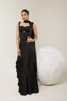 Command the spotlight in our Black Corset Saree — a sculpted silhouette that marries structure with fluidity. Designed in luxurious fabric, the corset contours the body with precision, while the pre-draped saree cascades effortlessly for a modern, yet timeless appeal. With refined gathers and a cinched waistline, this ensemble is your go-to for elevated celebrations and unforgettable entrances.