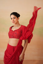 Deepika Chadha's stunning Red dupion fabric is blouse beautifully adorned with intricate tonal sequins, cutdana, thread, embroidery. The flowy Georgette stitched saree is perfect for wedding and festive season.