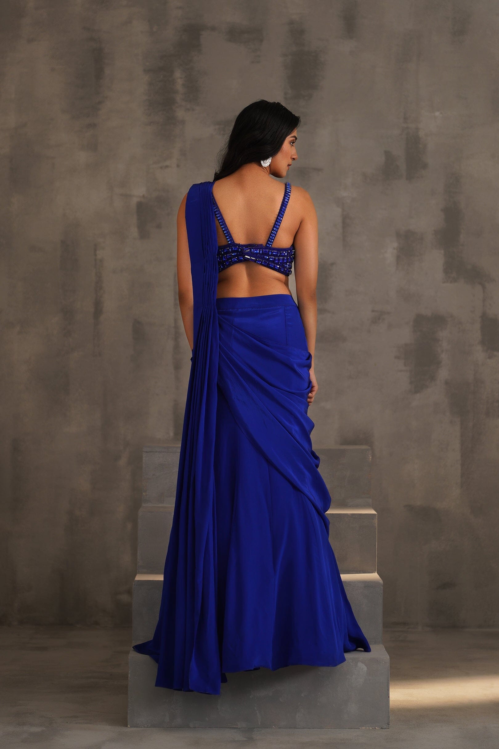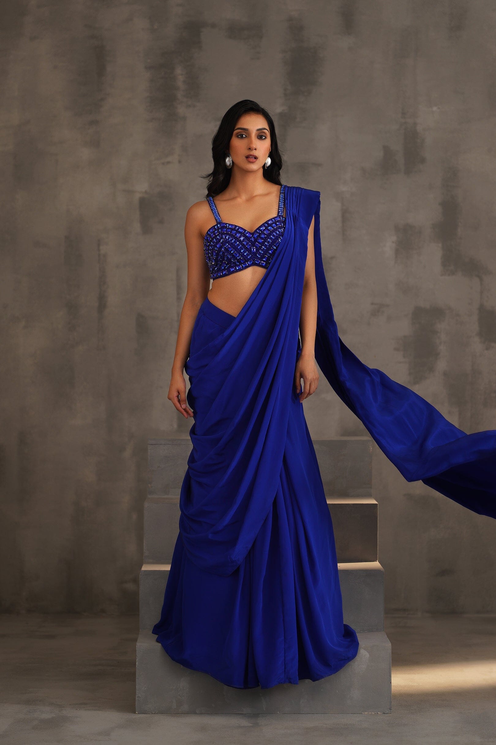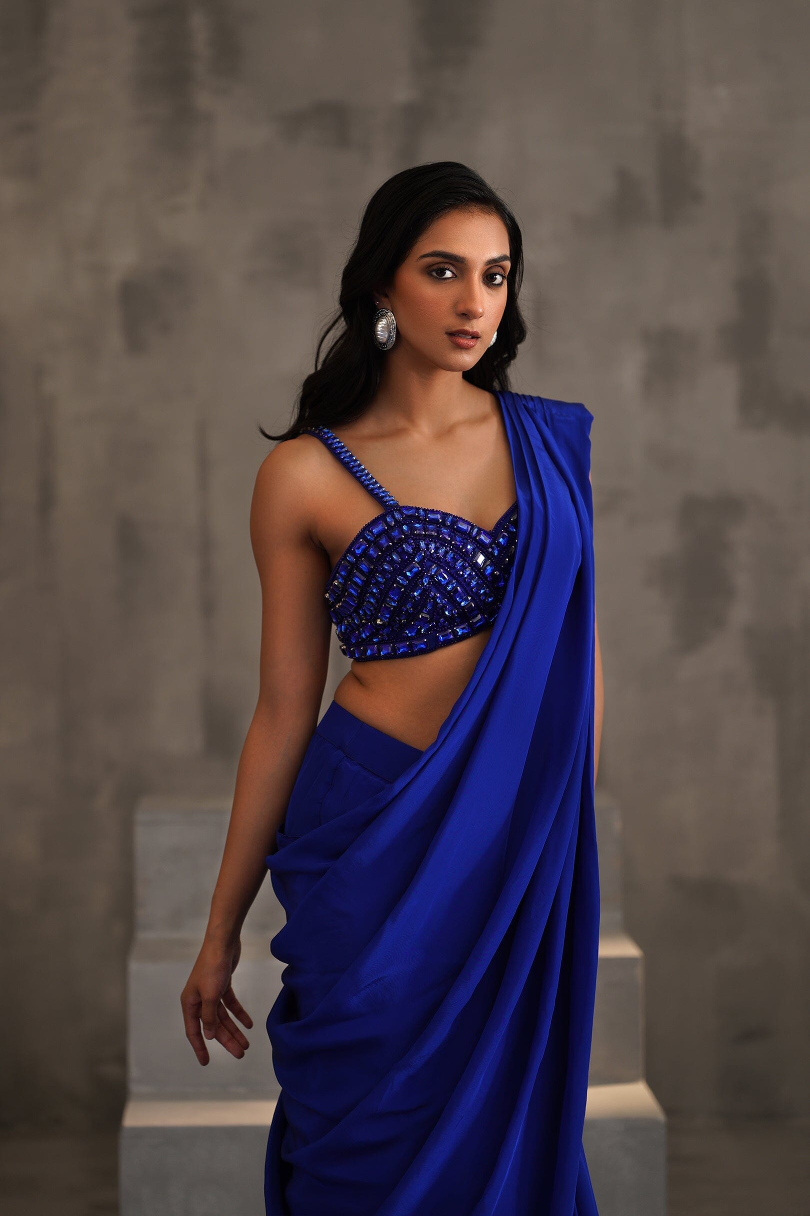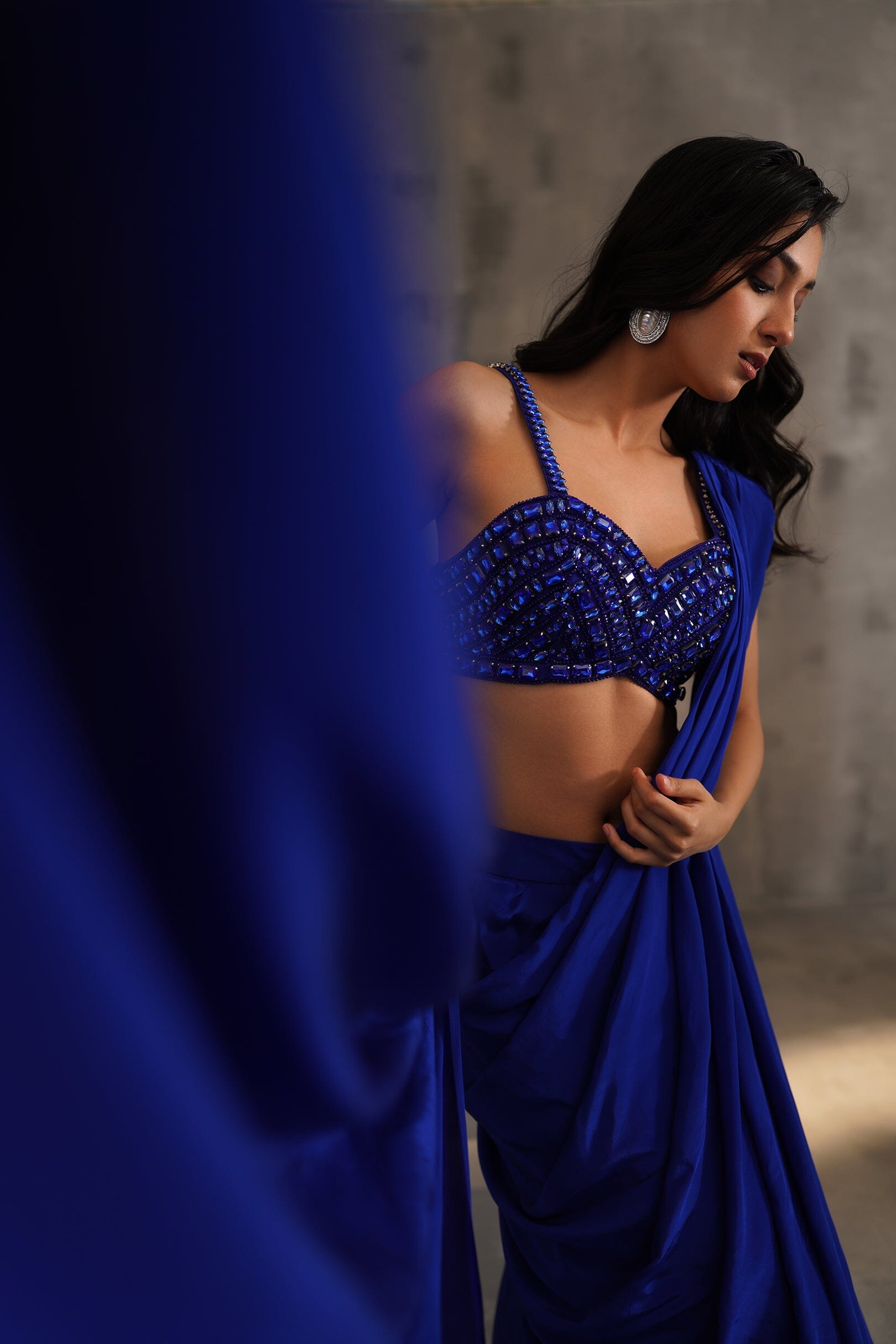 Deepika Chadha's stunning royal blue blouse beautifully adorned with intricate stones and crystal embroidery. The flowy crepe stitched drape saree is perfect for wedding and festive season.