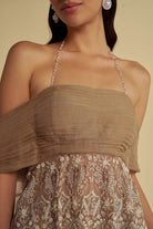 This ensembles is all about a sophisticated blend of the timeless classic with soothing hues and intriated craftmanship . This ensembles comprise with fine pleats on the offshoulder kurta, and sharara with circle cit from thighs.