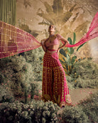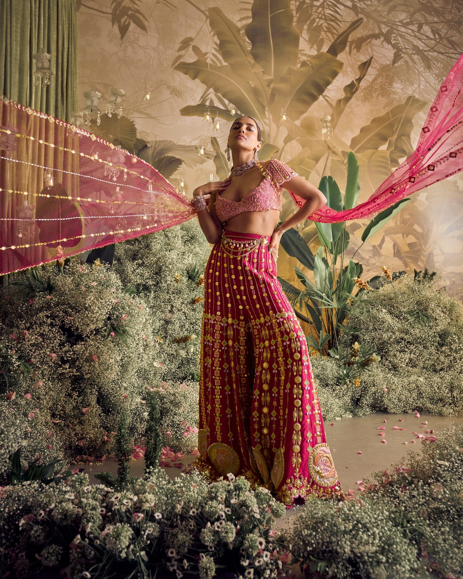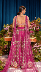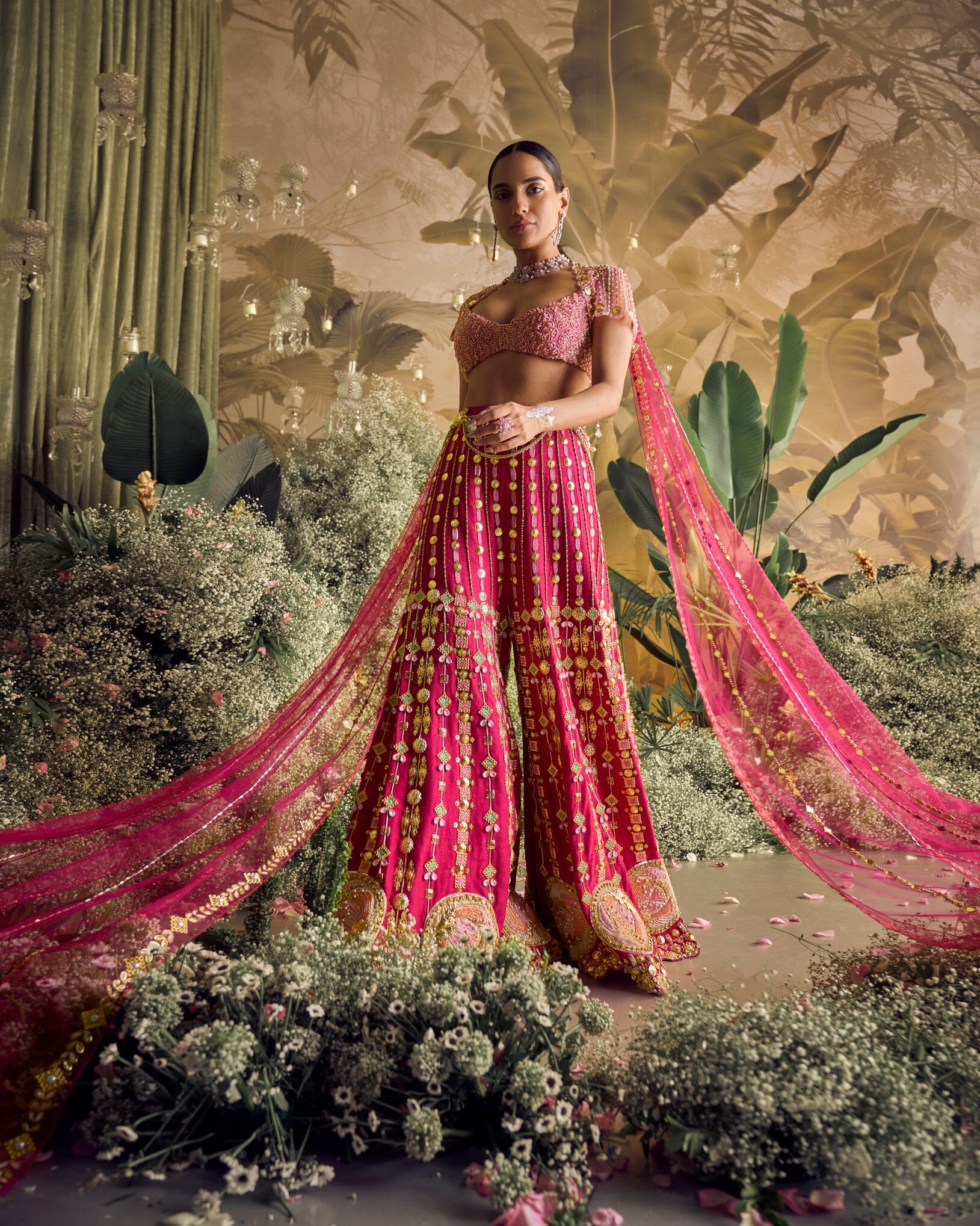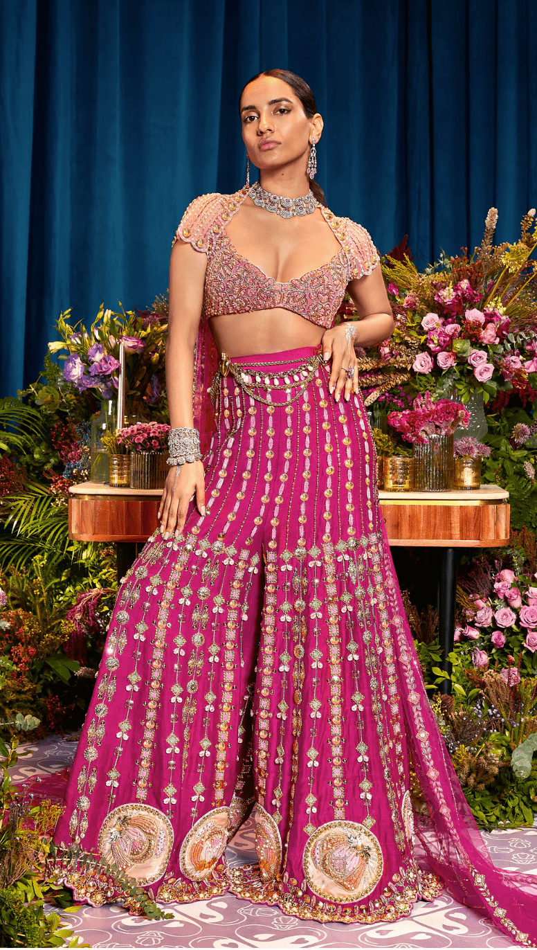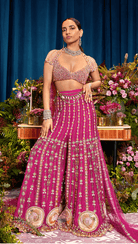Elegance meets Artistry in our Magenta sharara Set. Raw silk pants in mesmerizing magenta, featuring fluid organza and metallic georgette patchwork. Rose pink blouse adorned with cut beads, metals, and pearls. Asymmetrical dupattas add allure, embellished with sequins and pearls."