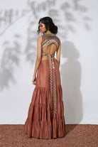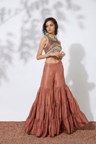 Pantalones sharara de triple capa de color naranja quemado y top corto sin espalda bordado con hilo, tubos, perlas, cuentas y espejos.