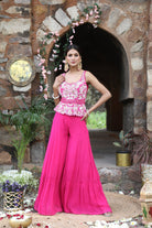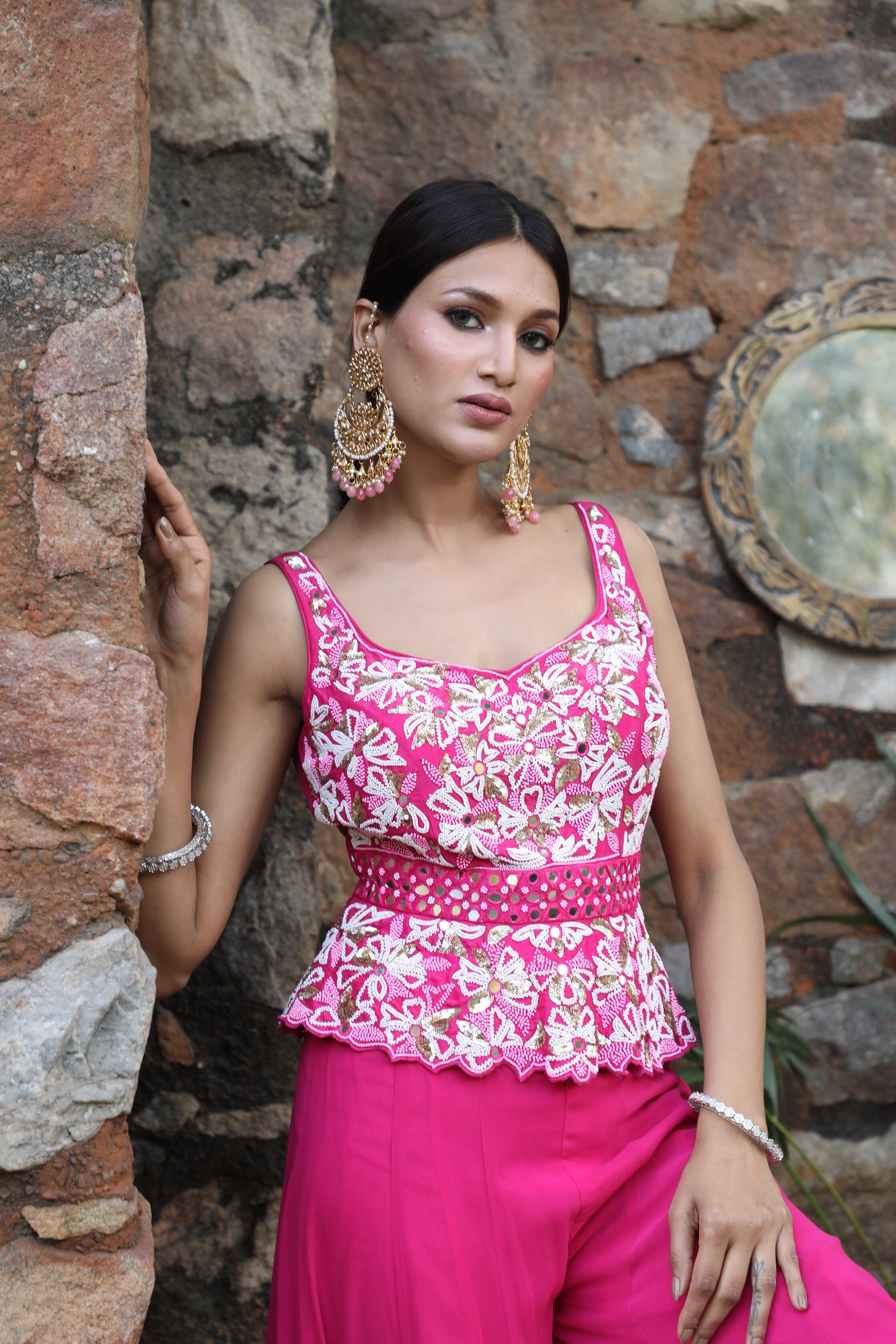 Presentamos aquí un peplum fuscia con swquence, cuentas y trabajo zari combinado con un conjunto sharara.