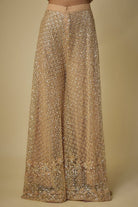 Drape yourself in opulence with this exquisite gold kurta sharara set, crafted in delicate net fabric. The intricately embroidered kurta is paired with gracefully flared sharara pants and a flowing dupatta, exuding elegance and grandeur. A timeless choice for brides or their mothers, perfect for celebrating special moments in style.