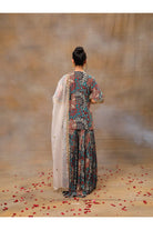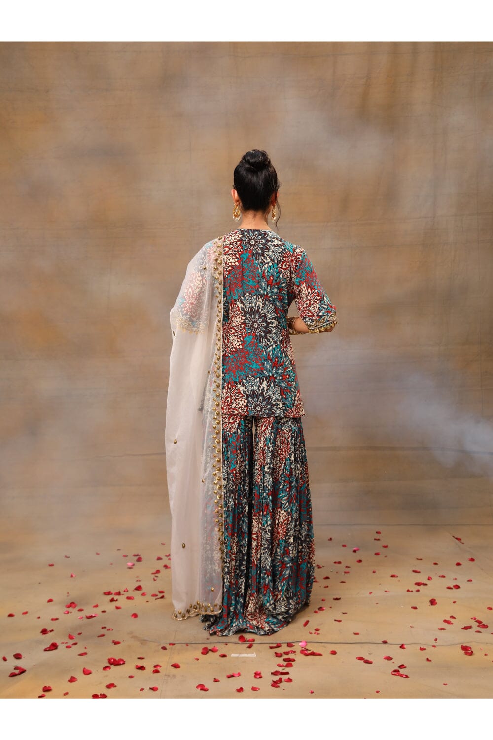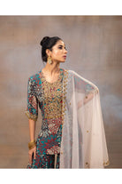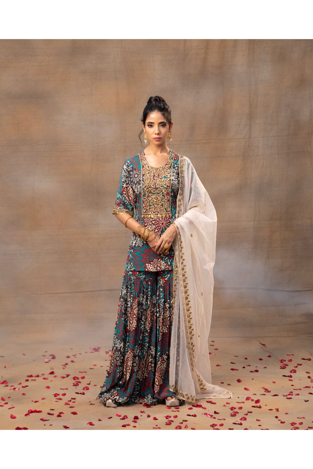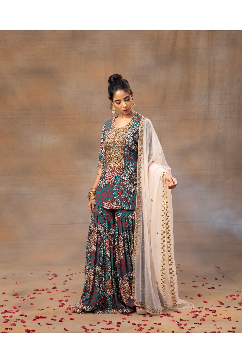 ¡Presentamos nuestra Kurta corta con estampado floral verde y exquisito bordado dorado en la parte delantera! Este elegante conjunto presenta elegantes mangas hasta los codos adornadas con delicados bordados, perfectamente combinados con pantalones Sharara a juego y dupatta color marfil con delicados bordados. La combinación de diseño contemporáneo y tela cómoda lo hace súper elegante, mientras que su facilidad de uso permite un movimiento sin esfuerzo, ¡lo que garantiza que te veas y te sientas fabuloso en cualquier ocasión! Abraza el encanto de este conjunto y destaca entre la multitud con sus llamativos diseños florales y su impecable artesanía.