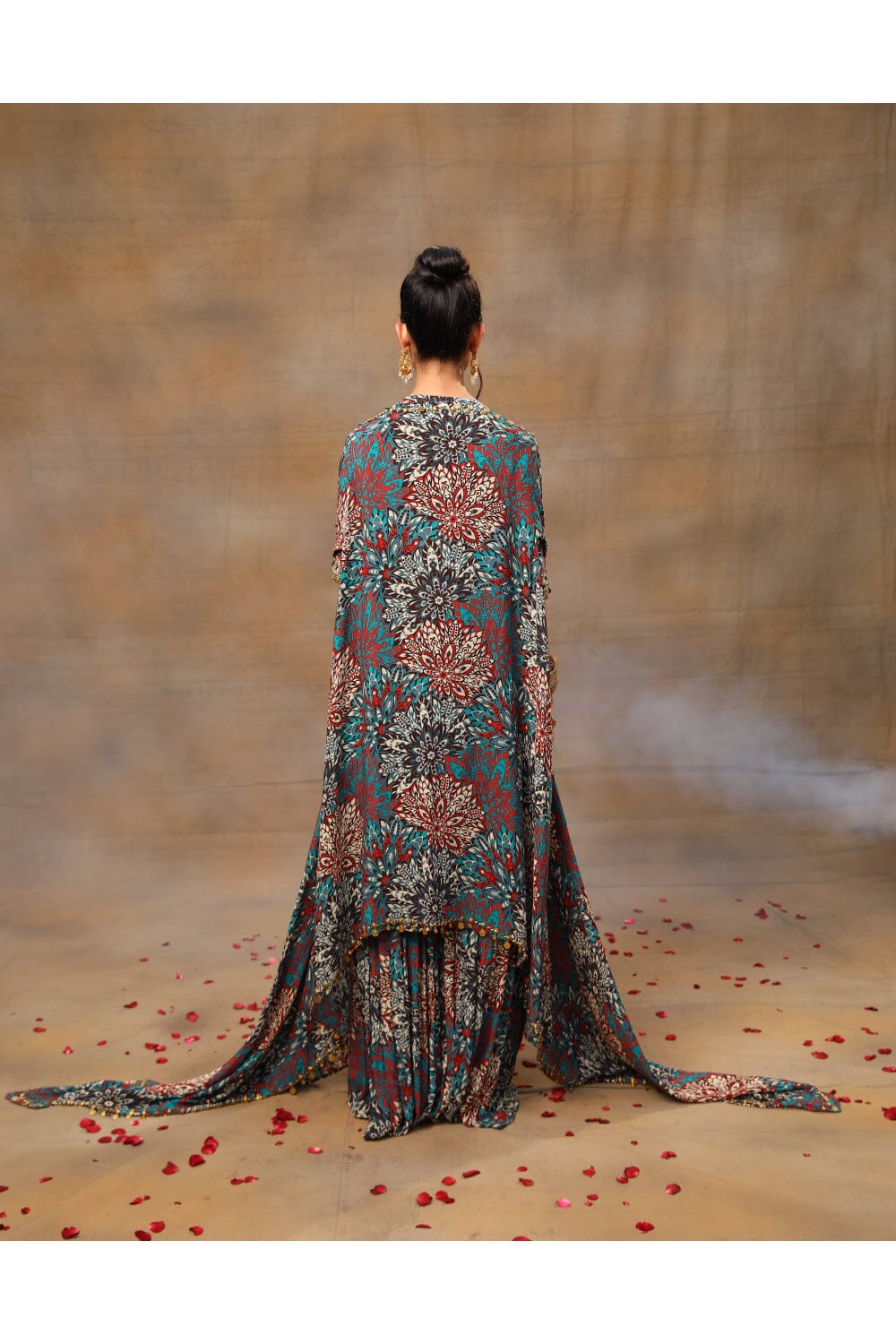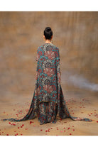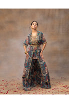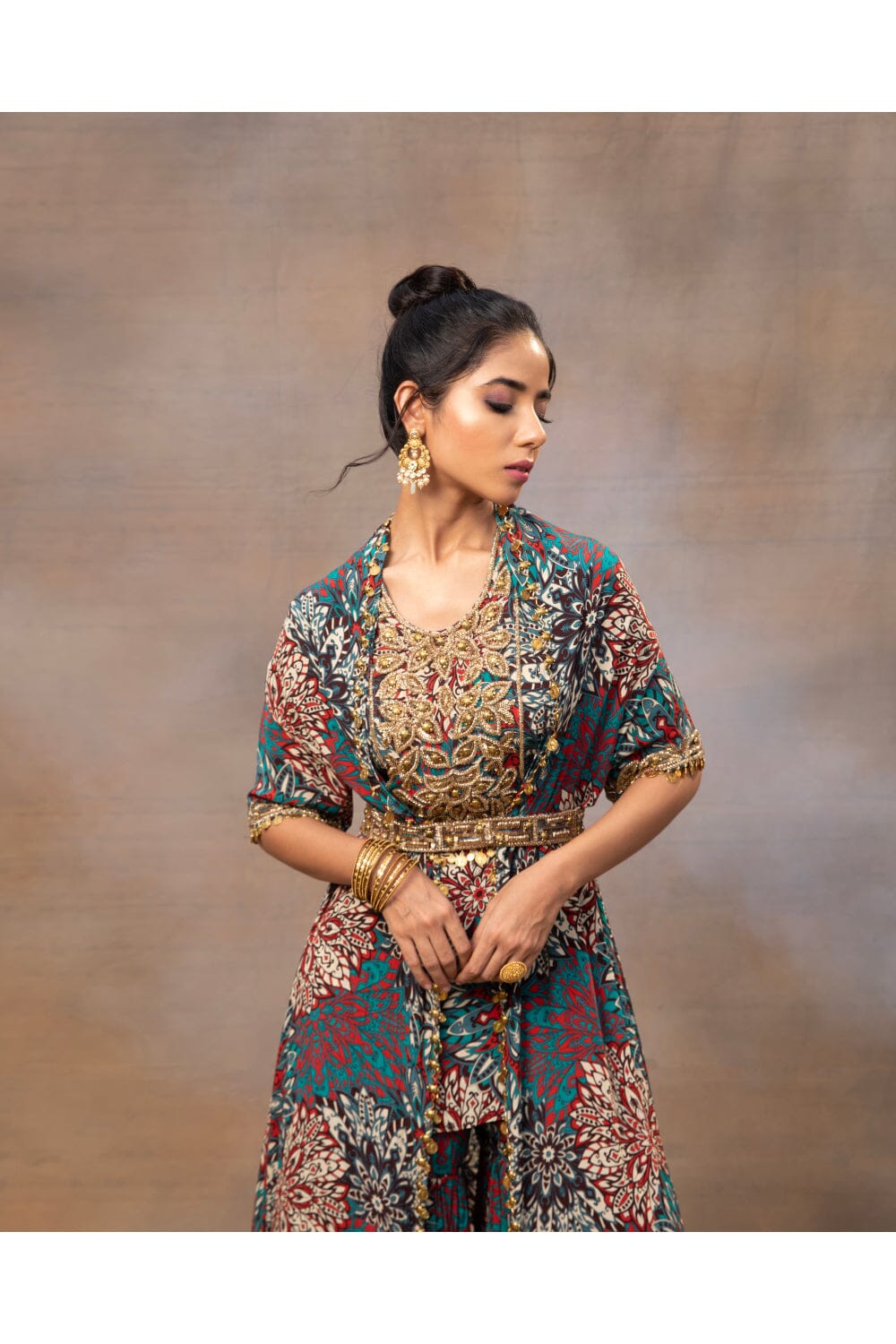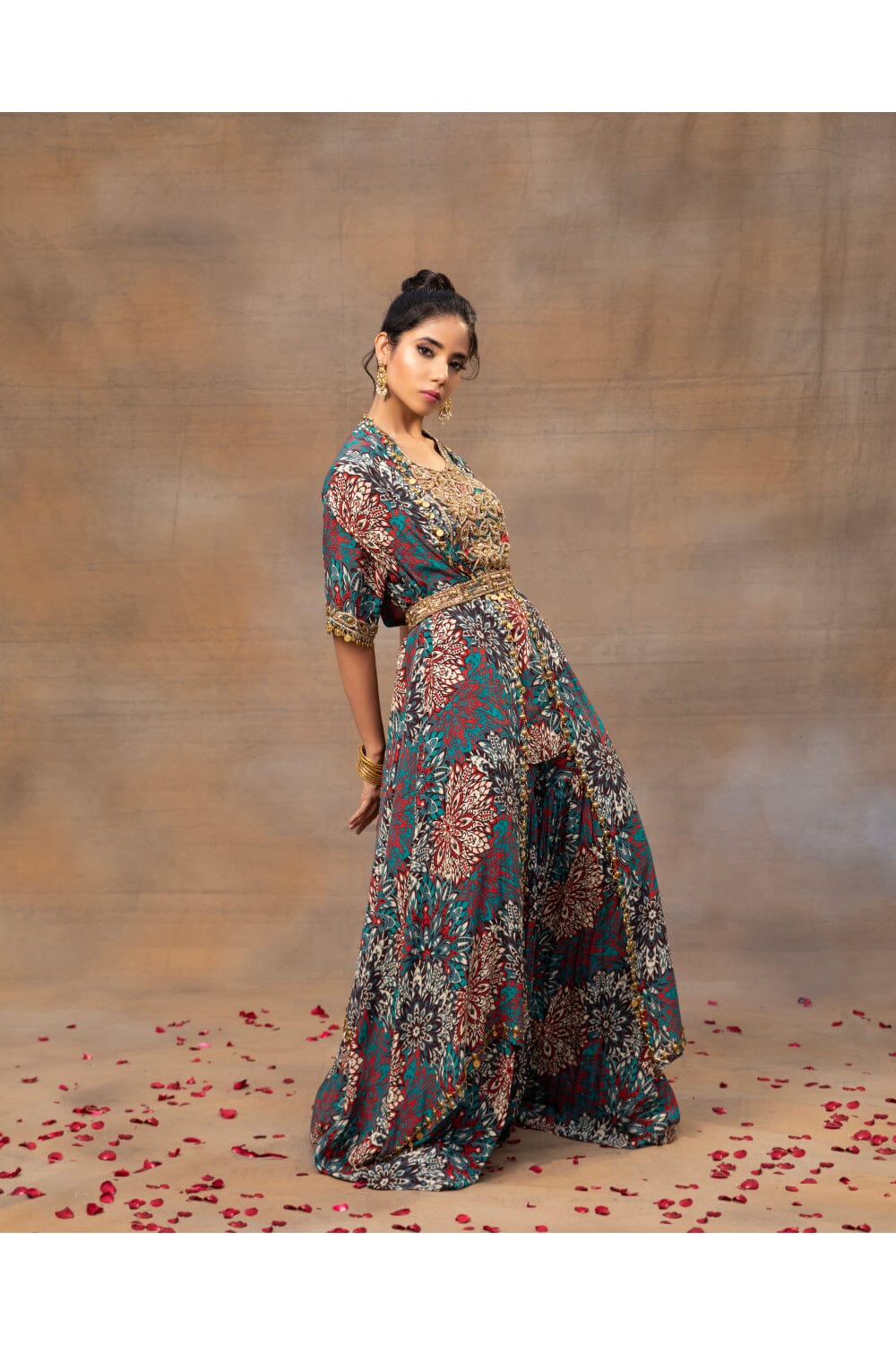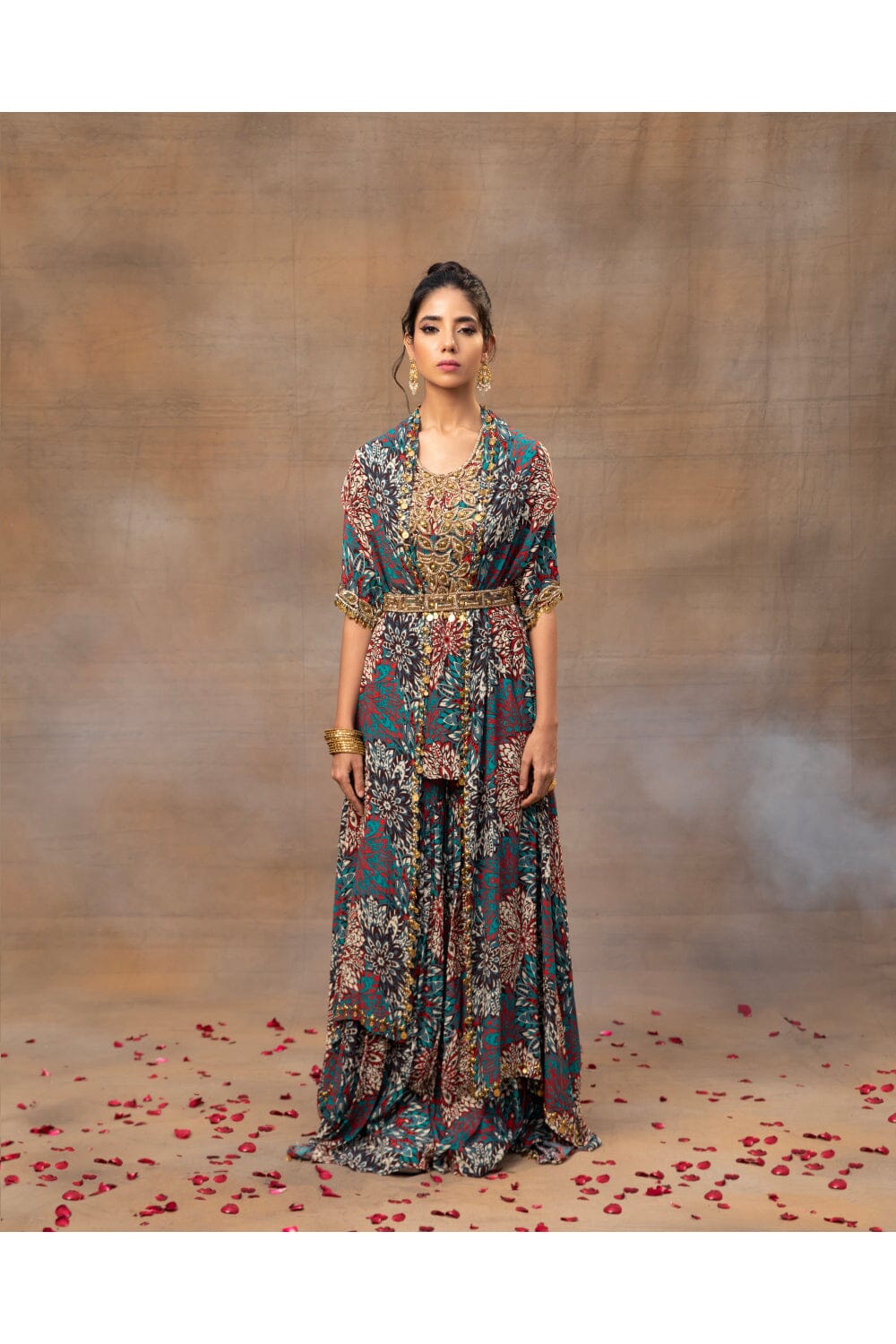 Eleva tu estilo con nuestro impresionante conjunto de kurta corta con estampado floral verde. Adornado con un exquisito bordado dorado, este conjunto rezuma elegancia. Combinado con pantalones fluidos sharara y una capa a juego, ambos adornados con delicados bordados y colgantes, es una combinación perfecta de gracia y encanto. Complete el look ceñindo la cintura con nuestro cinturón bordado de intrincado diseño, agregando un toque de sofisticación a su conjunto. Abraza la belleza de la tradición y la moda contemporánea con este cautivador conjunto.