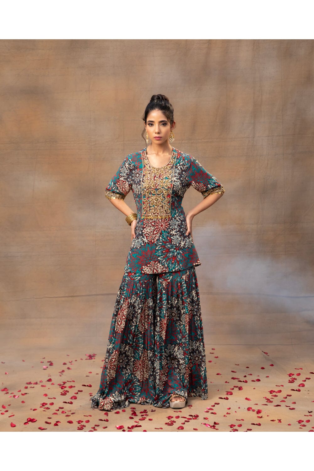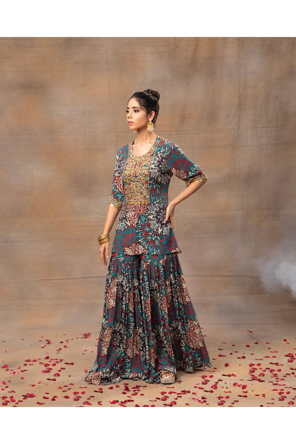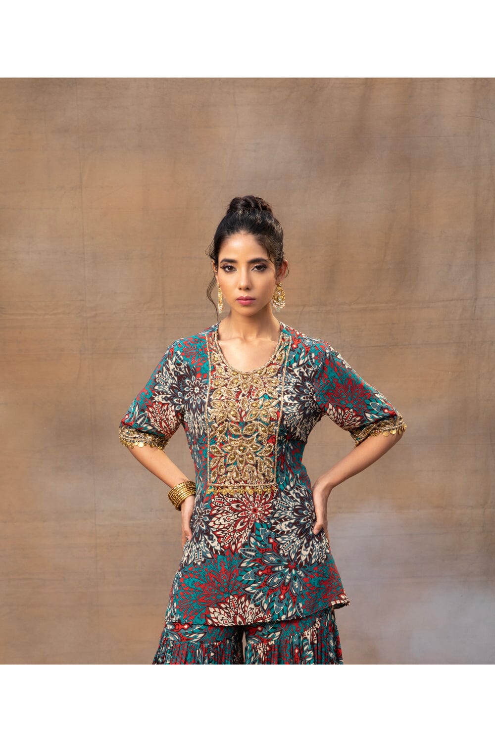 ¡Presentamos nuestra Kurta corta con estampado floral verde y exquisito bordado dorado en la parte delantera! Este elegante conjunto presenta elegantes mangas hasta los codos adornadas con delicados bordados, que combinan perfectamente con los pantalones Sharara a juego. La combinación de diseño contemporáneo y tela cómoda lo hace súper elegante, mientras que su facilidad de uso permite un movimiento sin esfuerzo, ¡lo que garantiza que te veas y te sientas fabuloso en cualquier ocasión! Abraza el encanto de este conjunto y destaca entre la multitud con sus llamativos diseños florales y su impecable artesanía.