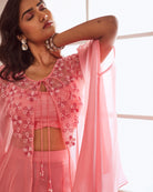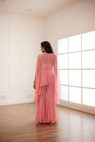 Croptop rosa melocotón y sharara combinados con una capa adornada con organza.