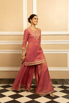 Handcrafted for elegance and charm, the Noor Pink Chanderi Tissue Sharara Set is a stunning choice for any occasion. This kurta is adorned with intricate embroidery with zari, sequins, and gota, creating a captivating visual appeal. Paired with a sharara made from luxurious tissue chanderi, this ensemble offers both comfort and style. Complete the look with a matching embroidered dupatta, making this a show-stopping set perfect for the trendsetter in you at any festive celebration.