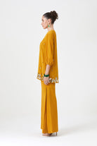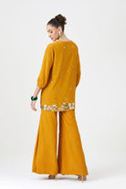 A rich, mustard sharara set that demands a dramatic entrance during all your pre-festivities. The sun kissed natural crepe silk pleated Kurta with the intricate Mukaish work pairs amazingly with our sharara pants.