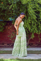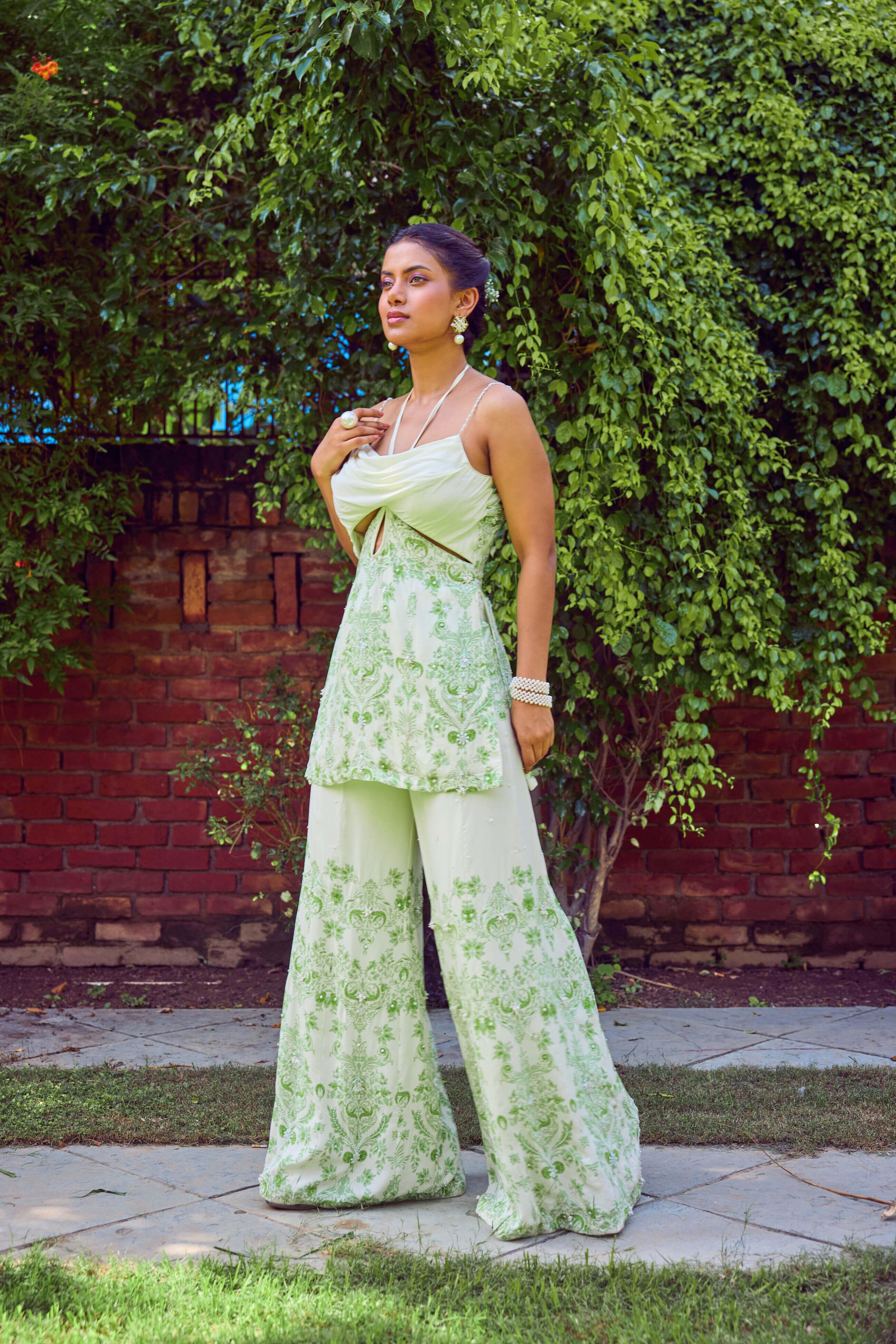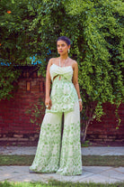 Our intricately embroidered kurta with pearl and lace detailing further highlighted with crystals, paired with a breezy summer fabric, Crepe, in a kali sharara is a prefect mix of comfort and finess for you.