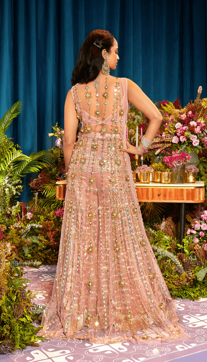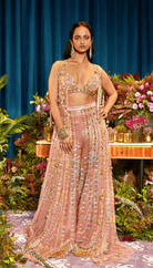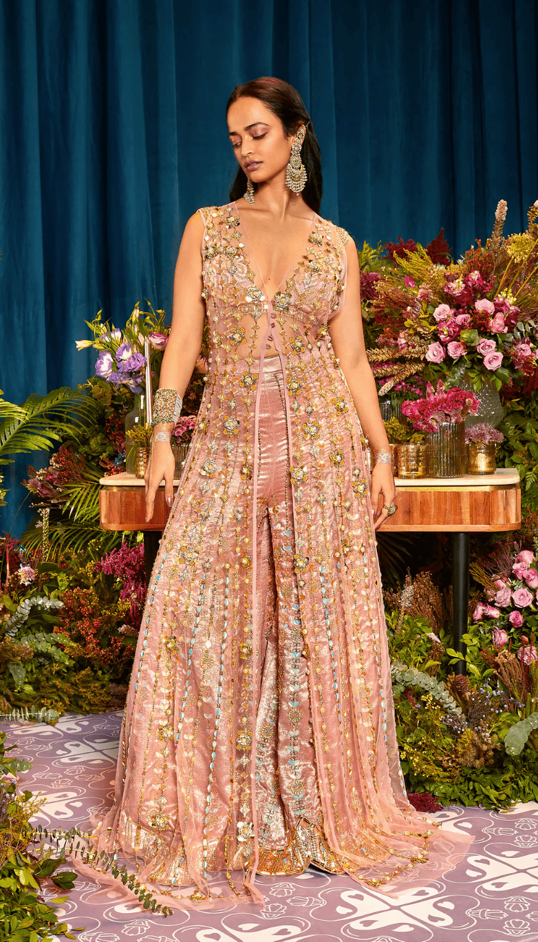 Introducing our Pink and Gold SHARARA SET - a captivating blend of elegance and glamour. Flared baby pink pants with golden foil, paired with a soft pink tulle sleeveless jacket. Our original bridal bralette shines with reflective cutbeads, metals, crystal stones, and crystals. The tulle jacket dazzles with lazer-cut acrylics, metals, pearls, and golden pearls."