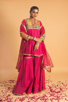 The Woven Chanderi Sharara Set in Pink features Gota applique work on the yoke and sleeves of the kurta. The outfit is paired with an organza dupatta and Sharara with Gota borders.