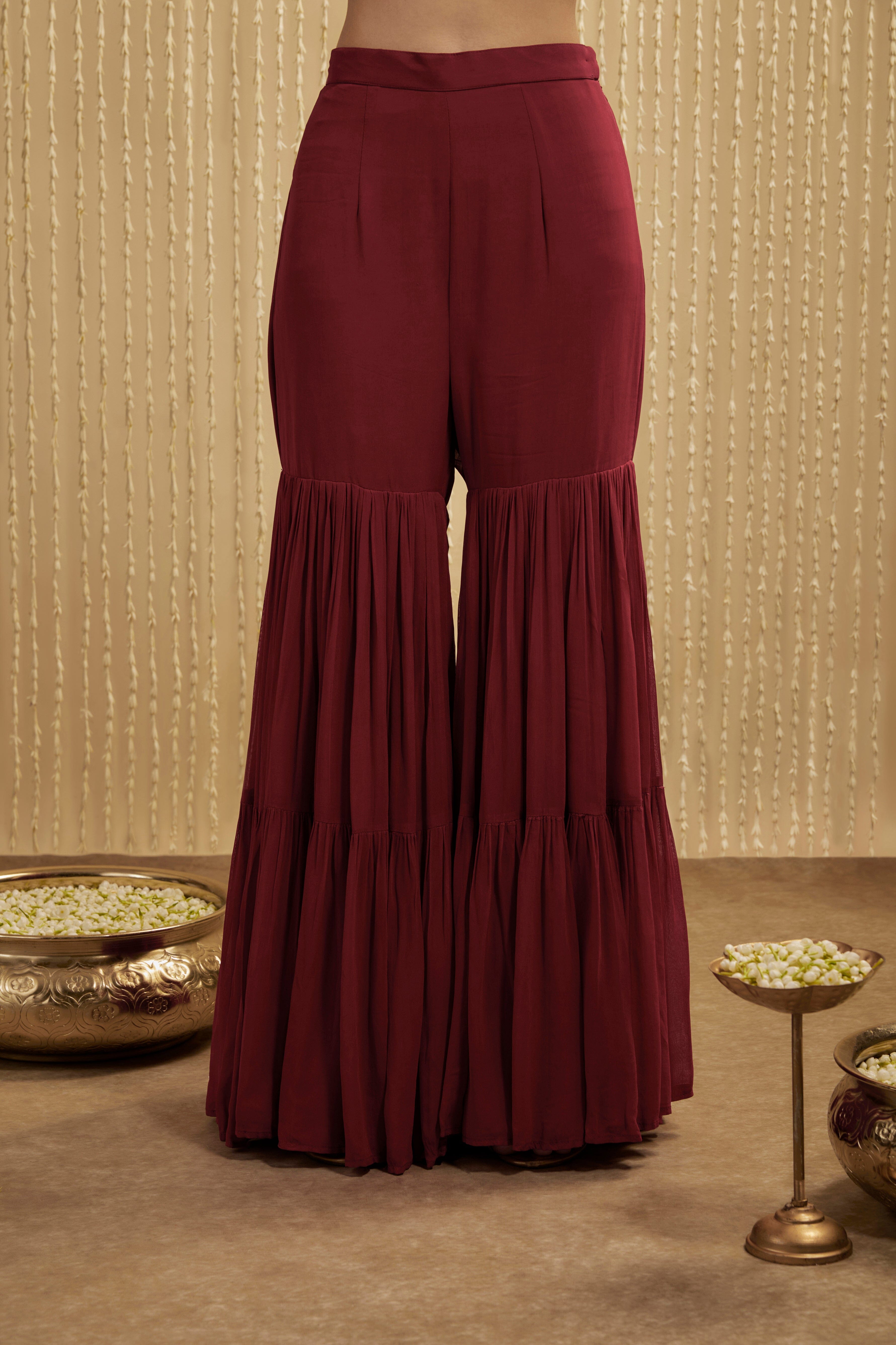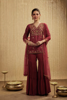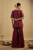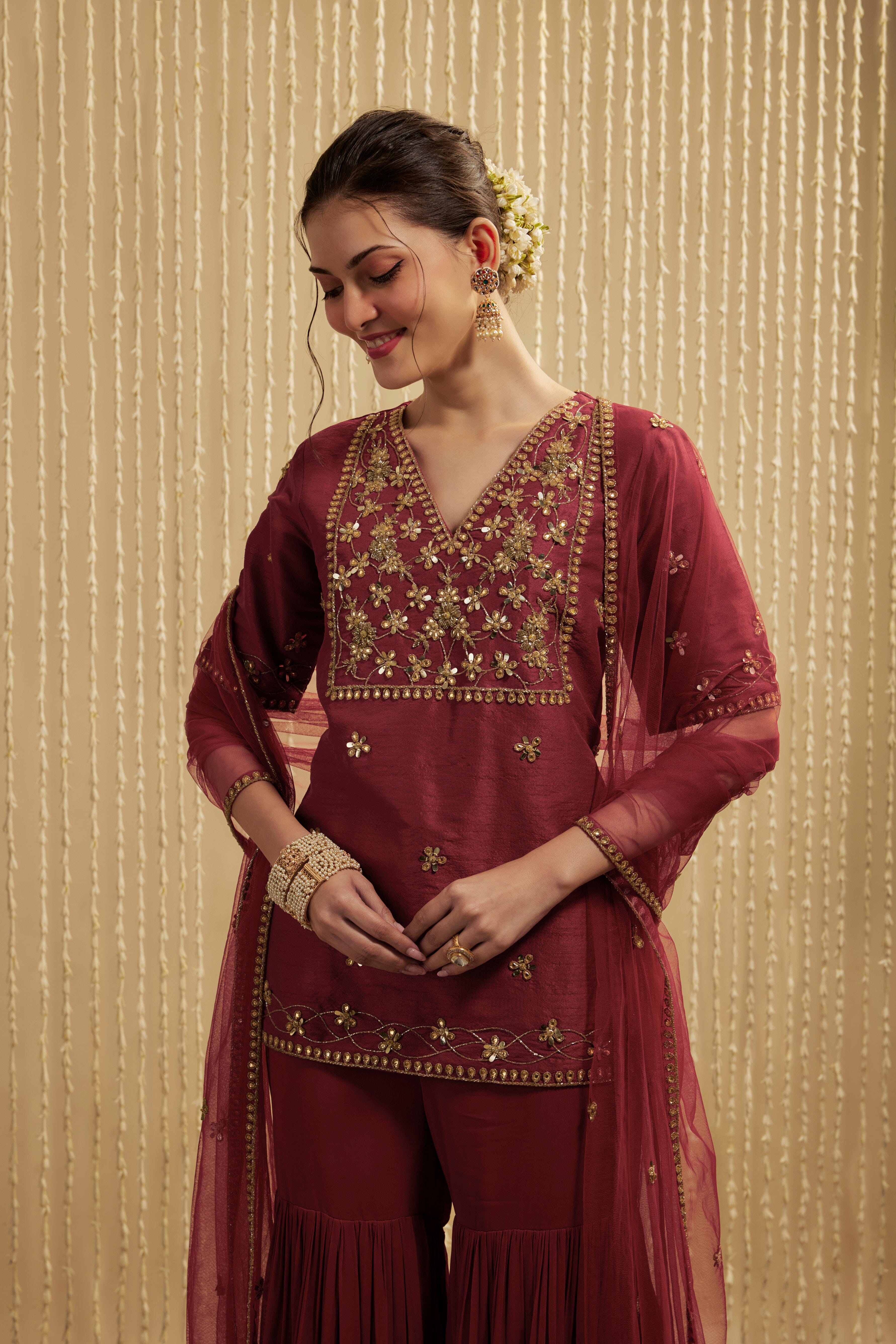 This stunning red short kurta in luxurious dupion silk, paired with georgette sharara pants and a delicate net dupatta, exudes dressy comfort and elegance. Embellished with intricate gold embroidery, it’s perfect for wedding functions or formal events, offering versatile styling options to dress up or down. The vibrant hue ensures you’ll make a lasting impression, turning heads wherever you go.