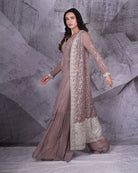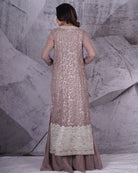 Envuelto entre los tonos tierra de gris y el brillante bordado floral plateado se encuentra este hermoso conjunto. La chaqueta está bordada con bordados florales realizados con hilo kasab y realzados con lentejuelas, piedras y cuentas de kardana. El escote kurta está adornado con bordados coordinados y el conjunto se combina con pantalones palazzo de georgette.