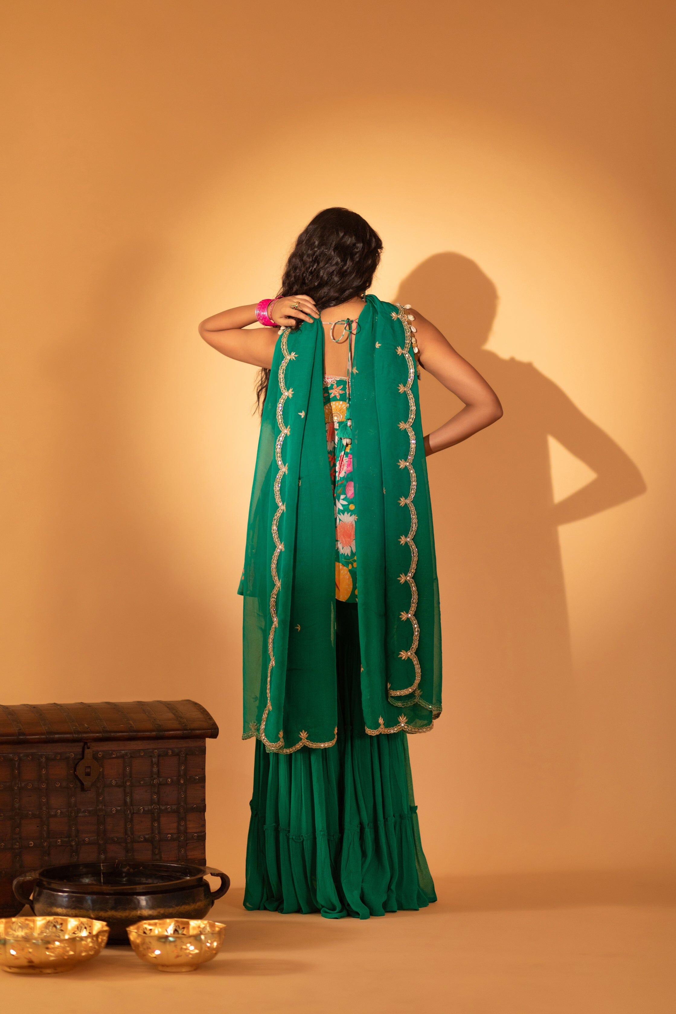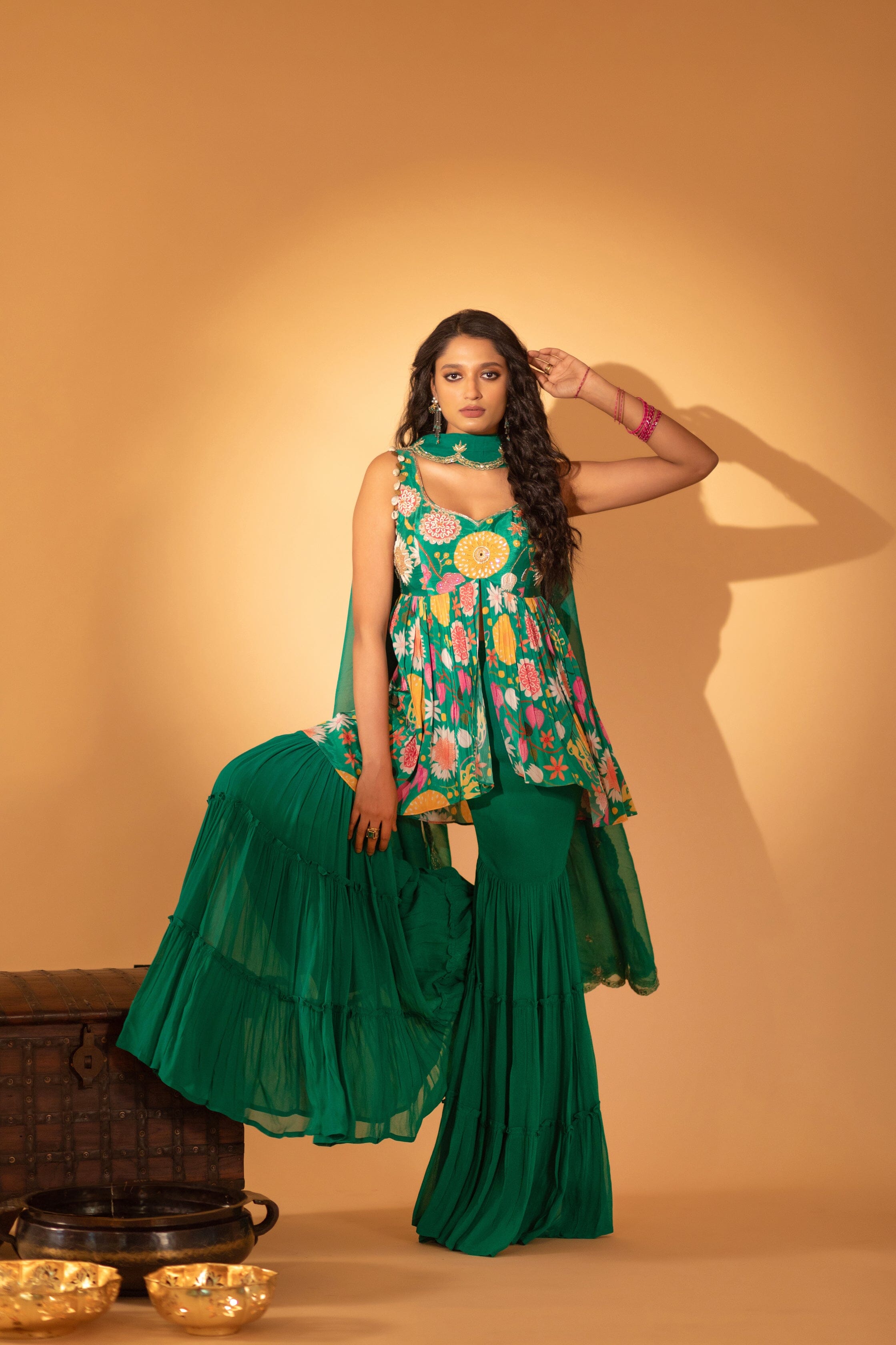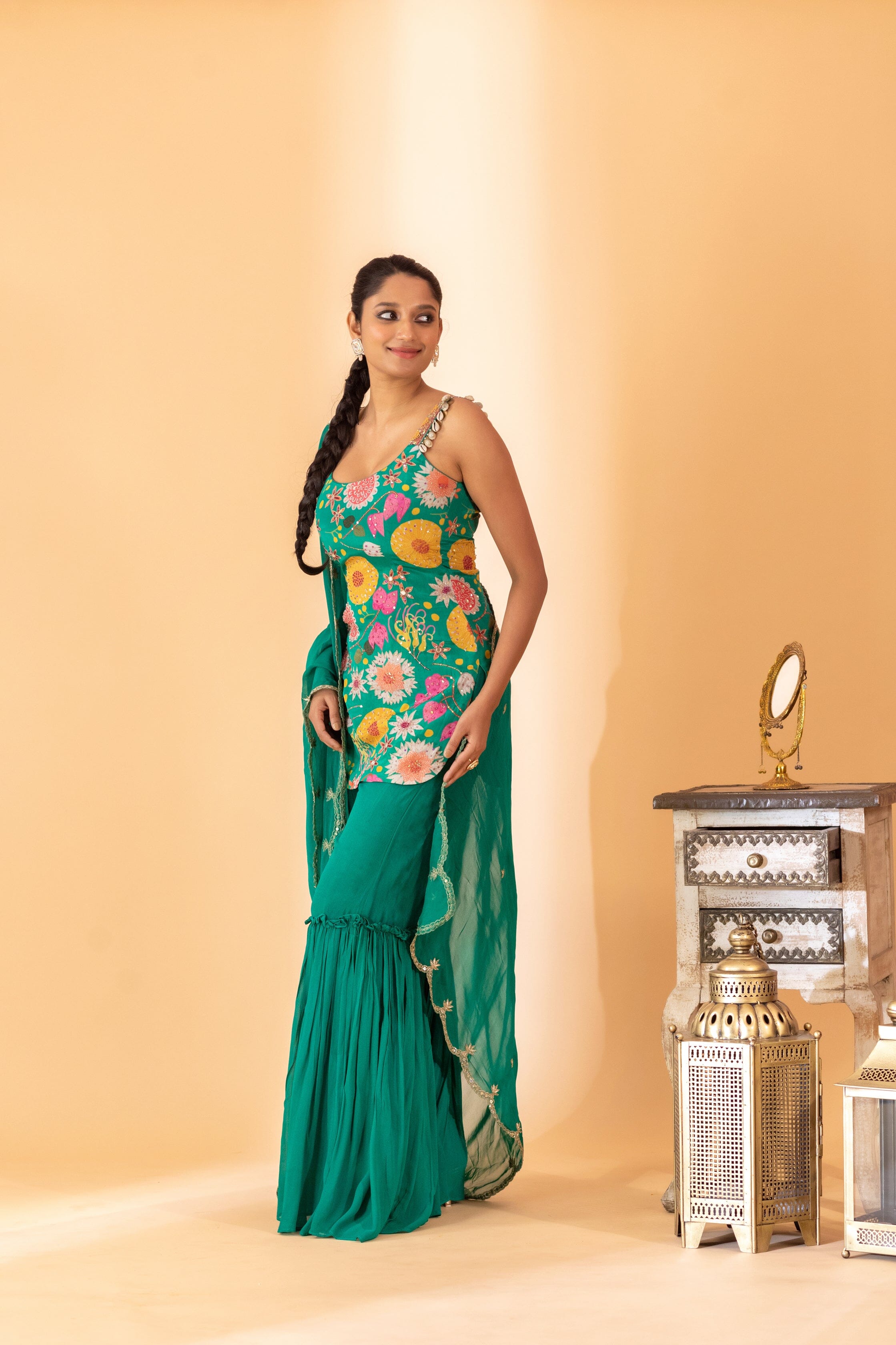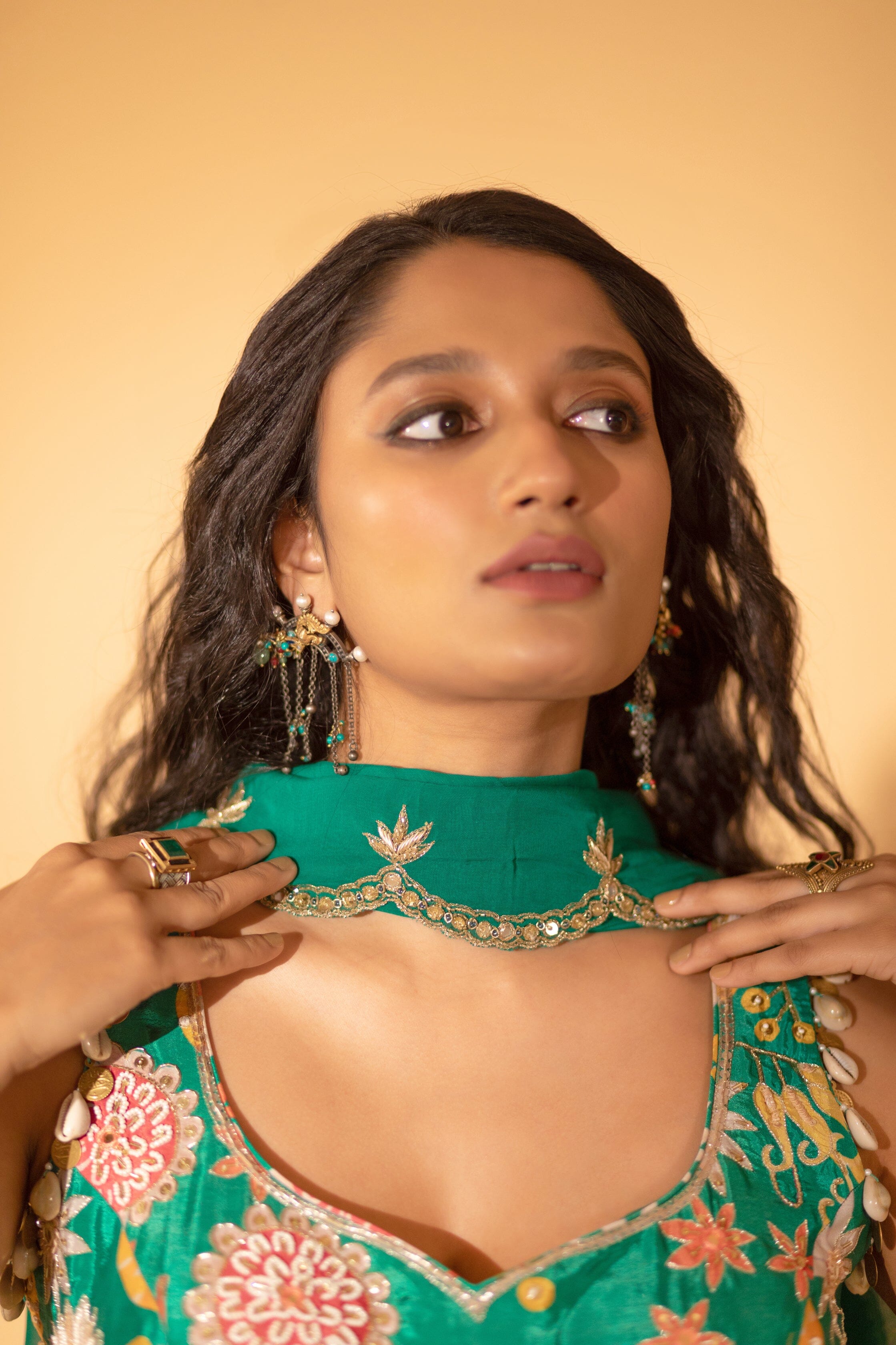 Elvina - Brick Brown, Ivory & Teal Sharara Set