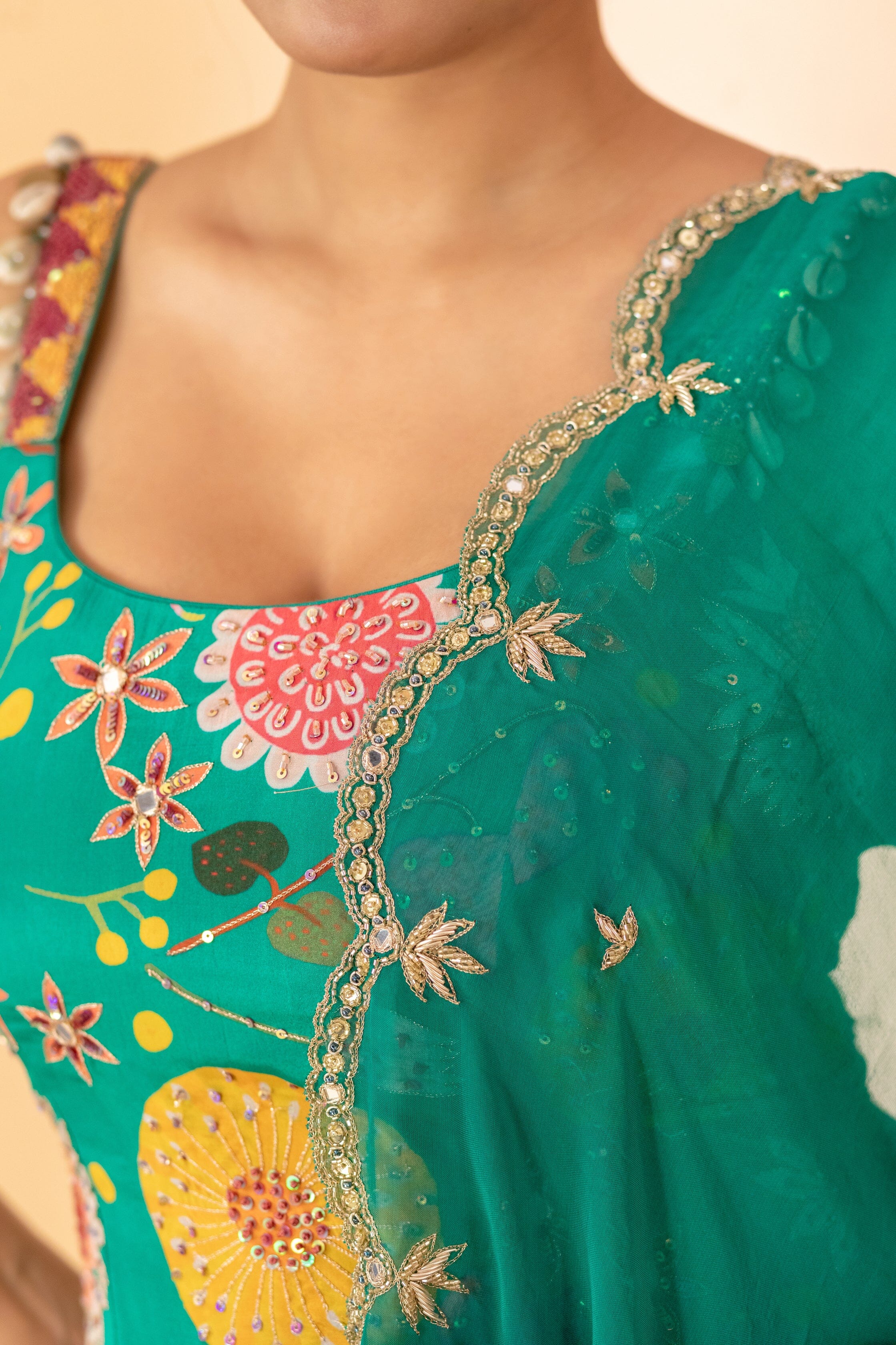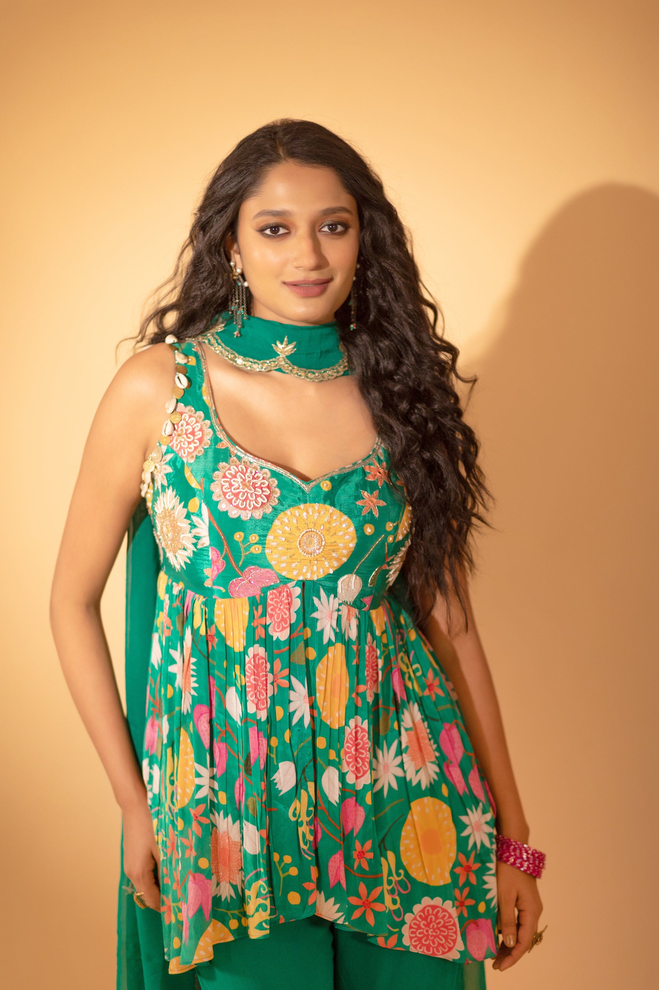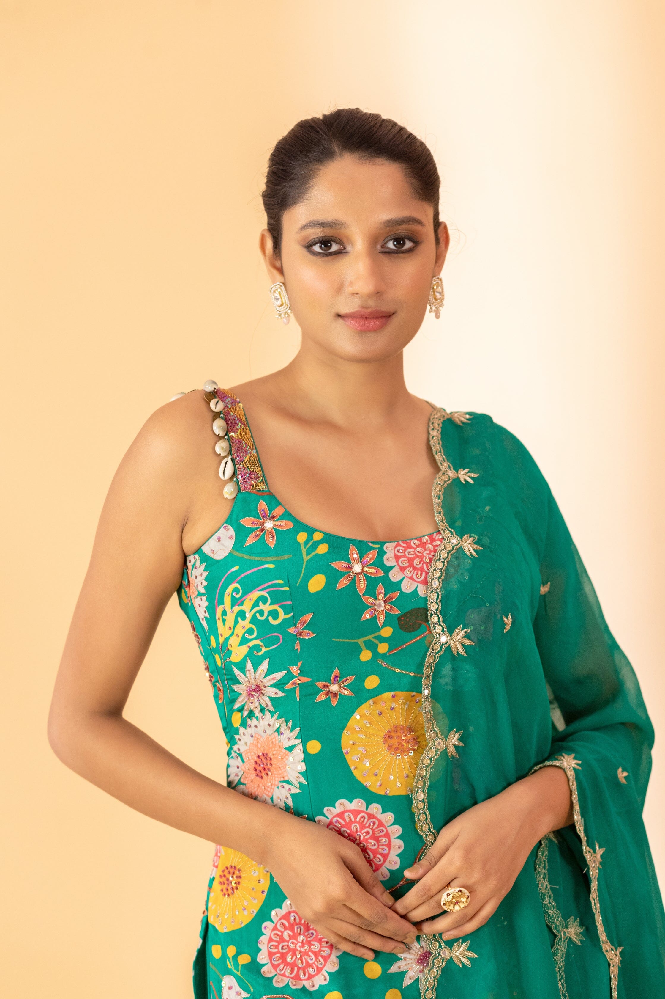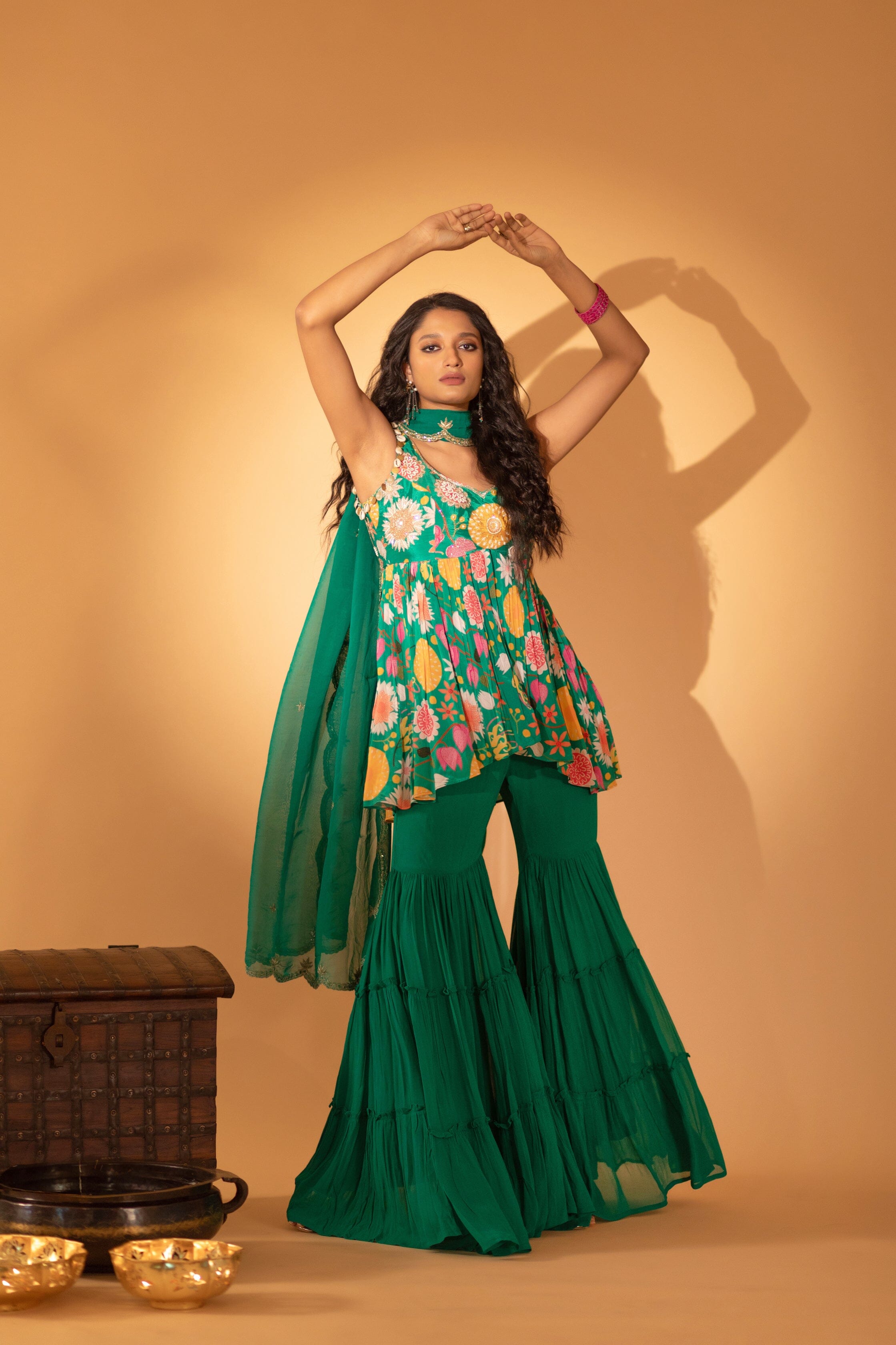 Elvina - Brick Brown, Ivory & Teal Sharara Set