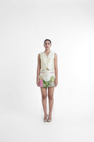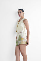 Our Ivory Silk Skort is made with silk base which also has mashru silk fabrics patches on it in pastel.