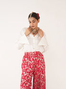 Conjunto de conjunto de seda Ether en rojo Presenta una camisa de talla única con botones rectangulares de metal y puños anchos, el look combina mejor con un pantalón acampanado de seda banarasi que tiene bolsillos a cada lado y espalda elástica.