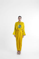 Gigi coord set in yellow features a free size shirt paired with free size wrap around skirt. This silhoutte fits and suits all body type and shape. Gigi shirt is made in Yellow colour on Pure cupro satin fabric where as the wrap around skirt is made in nysa silk. The touch and feel of the set is super soft and buttery. The shirt has a contrasting green brocade patch in the center.