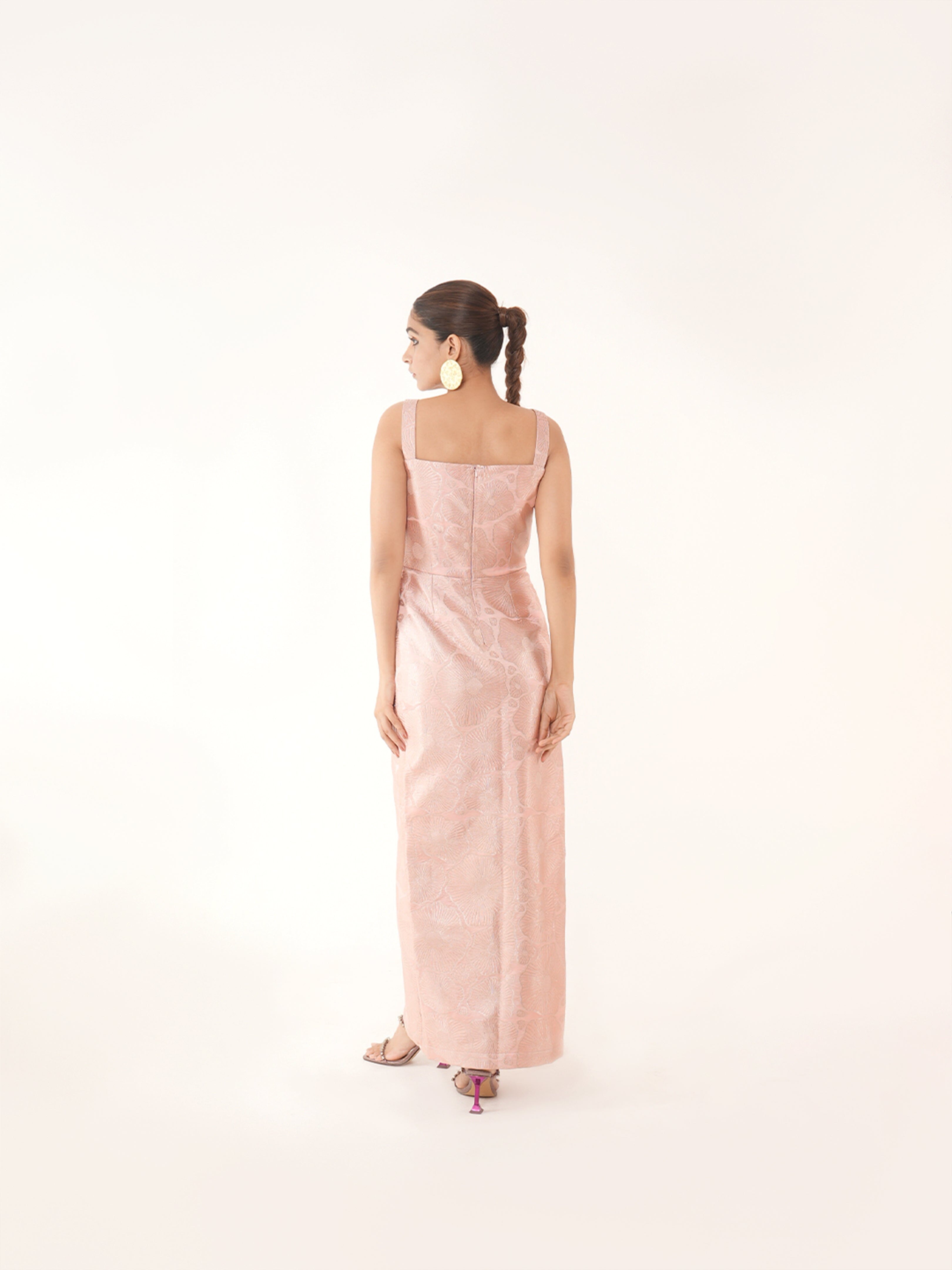 El vestido de seda rosa Kaizen presenta un vestido de tiras con una abertura en la parte delantera. El vestido está confeccionado con tejido zari jaal completo con un hermoso motivo floral desordenado.