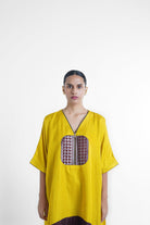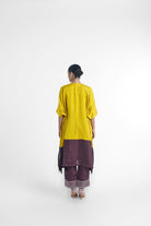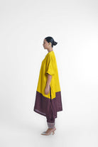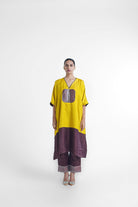 Kate kaftan kurta set has free size kaftan top which fits and suits all body type paired with relaxed fit pant which has elasticated waist and pockets on each side. The set is made in Yellow/ Mustard and brown nysa silk, with a banarasi brocade center patch.