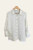 La camisa Lea de talla única en marfil/blanco presenta una camisa de gran tamaño que fluye libremente con botones de metal y un puño exagerado.