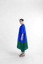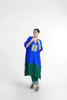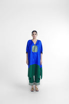 Moss kaftan kurta set has free size kaftan top which fits and suits all body type paired with relaxed fit pant which has elasticated waist and pockets on each side. The set is made in blue and green nysa silk, with a banarasi brocade center patch.