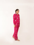 Conjunto de conjunto de seda Radha en rosa. Presenta una camisa corta de seda con cuello safari mejorado y puños de tejido jaal, combinada con un pantalón acampanado de seda de cintura alta que tiene bolsillos a cada lado.
