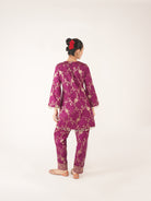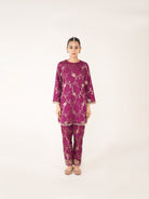 Conjunto Kurta de seda Rekha en morado Presenta un corte relajado Una kurta de línea combinada con un pantalón estilo pijama de seda. El conjunto representa un motivo phool patta en forma circular tejido en zari dorado.