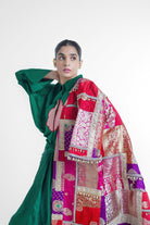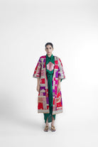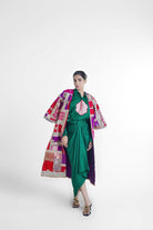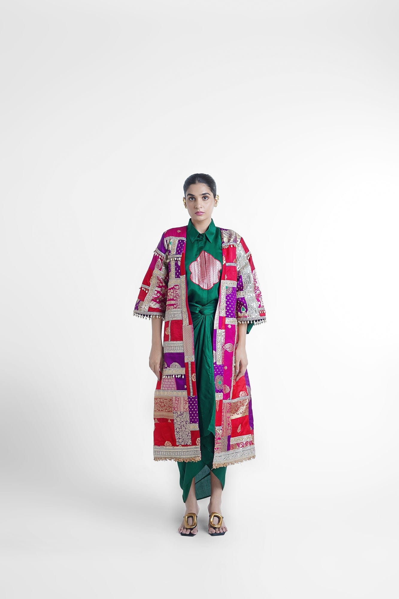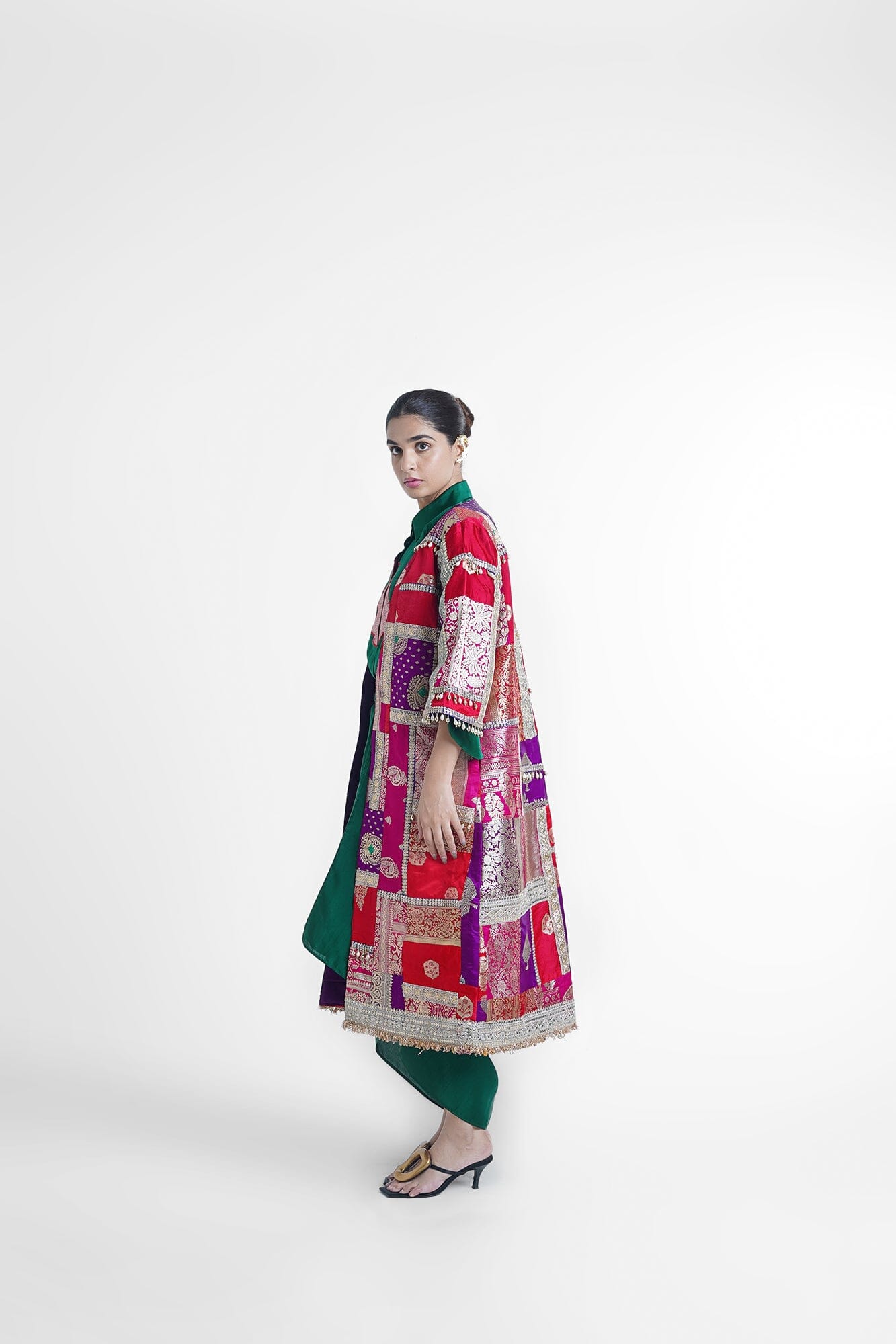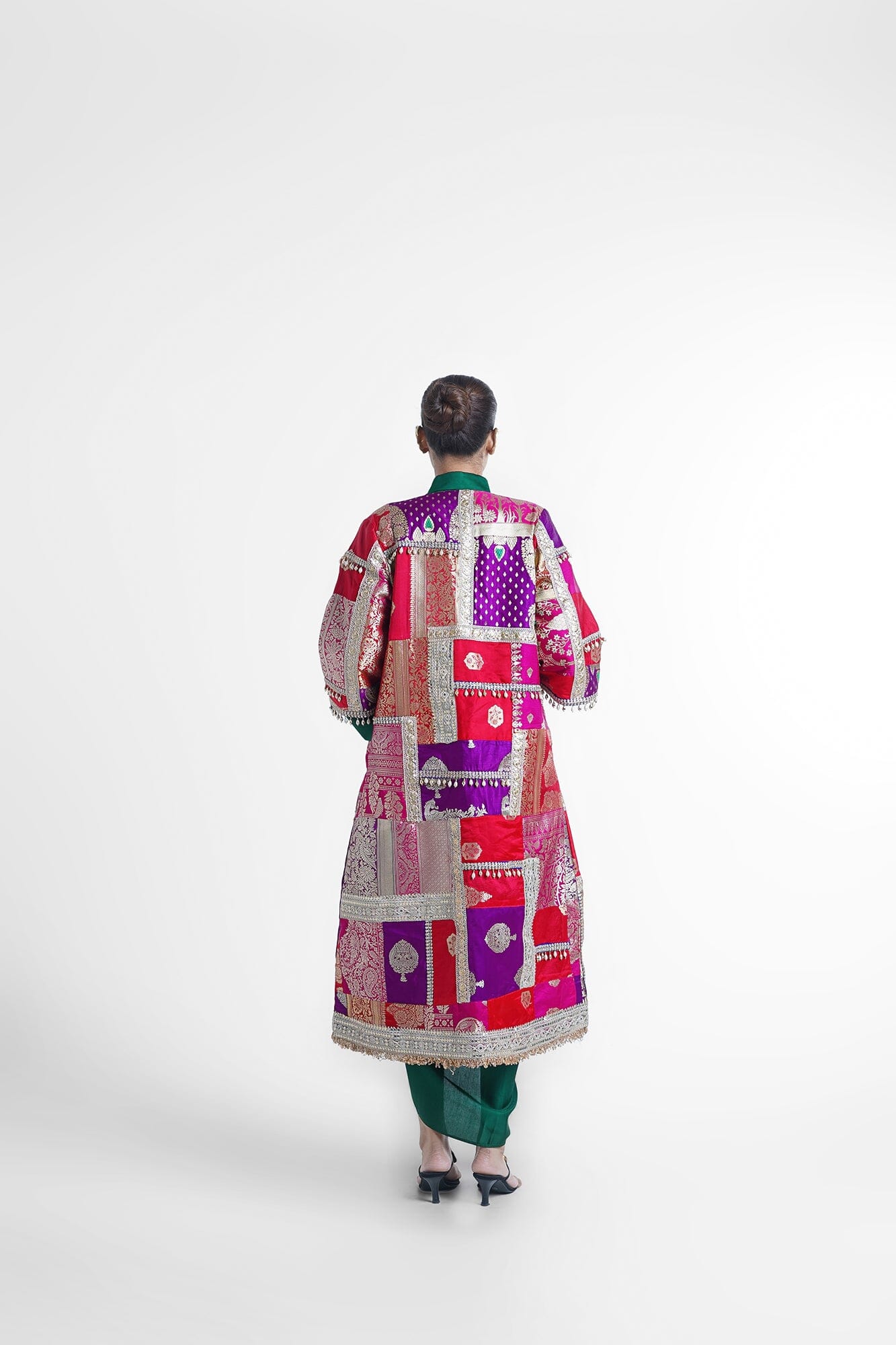 Roma Upycyled Long Jacket is made with banarasi silk patches that are placed with hand and further enhanced with decorative gold laces and tassels. The jacket has pockets on each side. This can we worn with Indian and western ensembles.