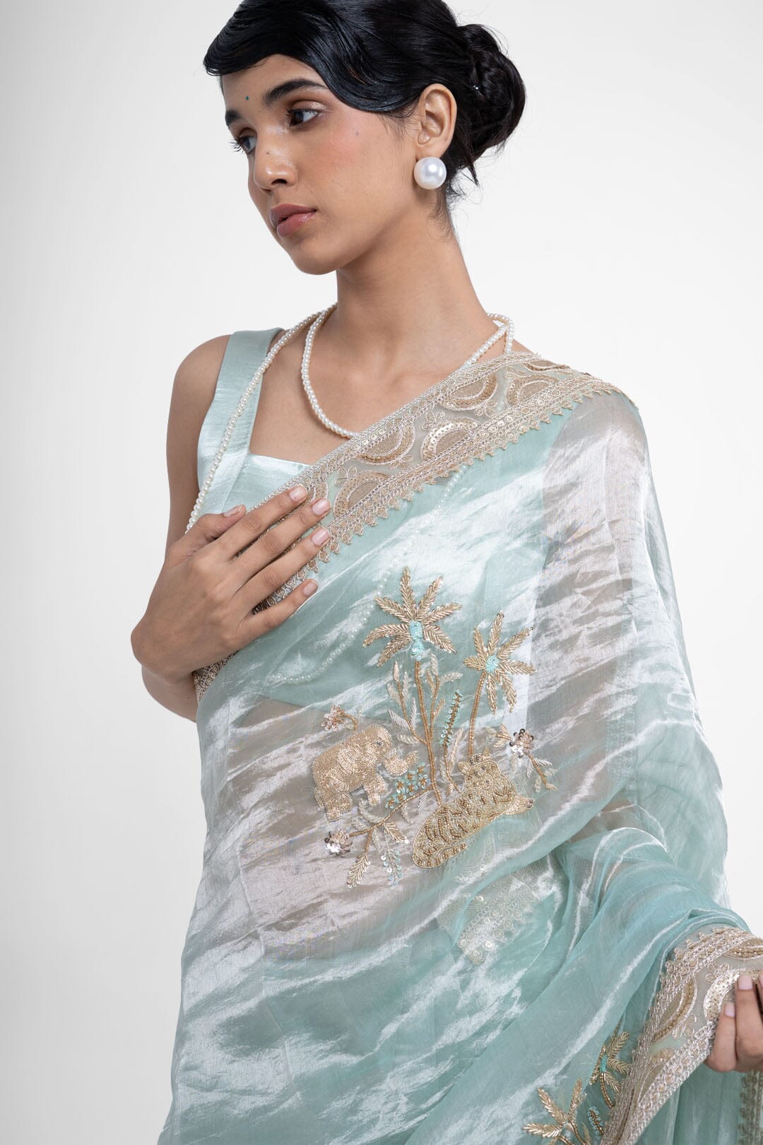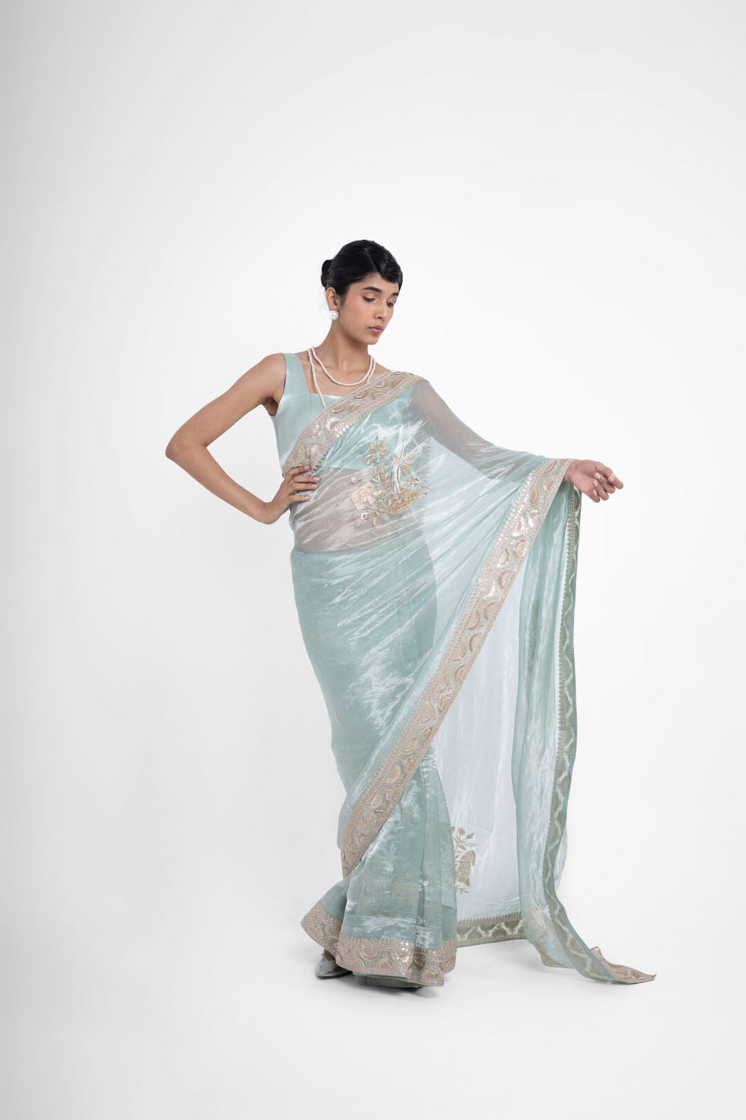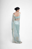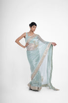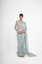 Samba pure tissue silk saree gives a tone of blue-green in different lighting, is fully hand embroidered with big shikargah boota, and the saree is completed with a gold border.