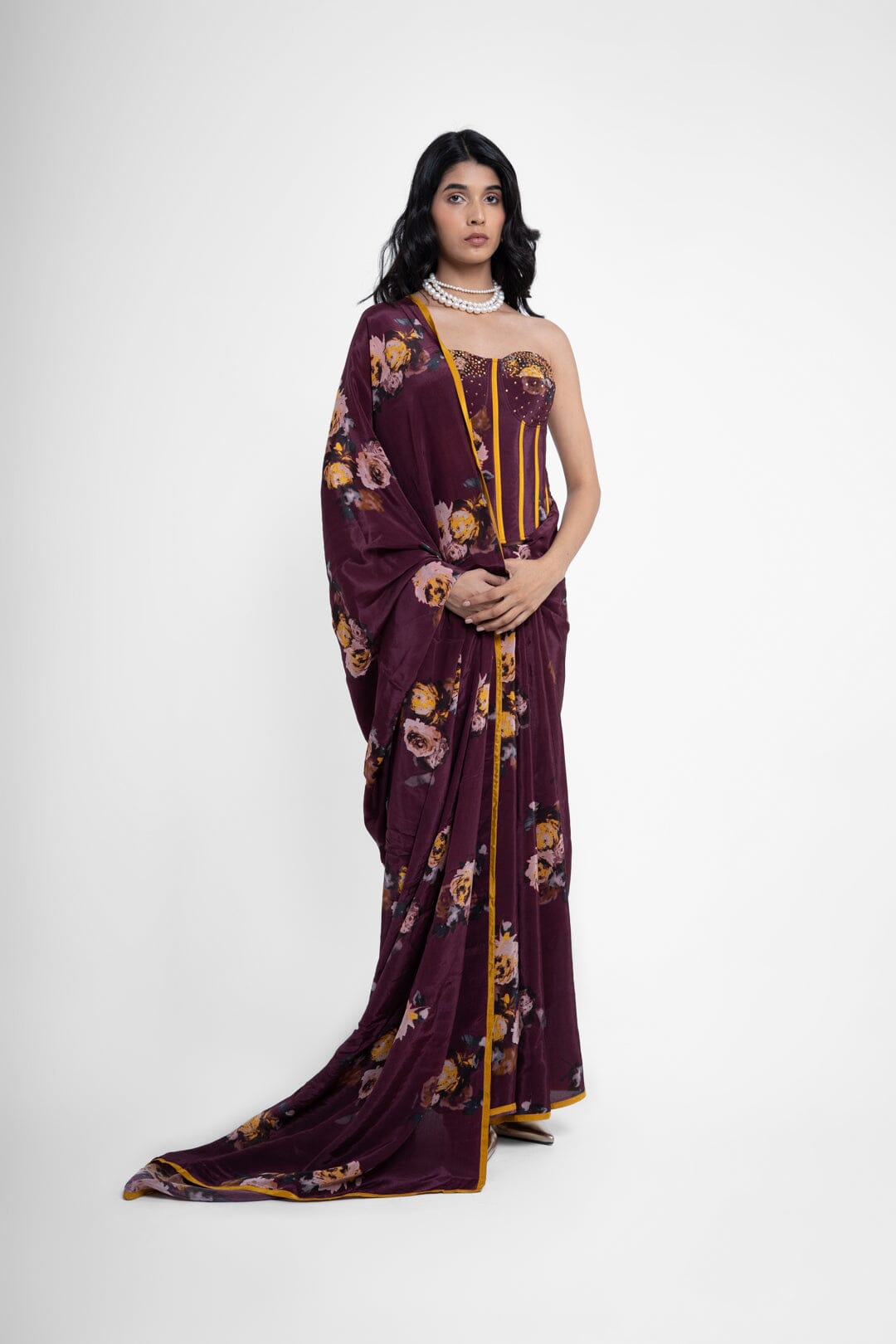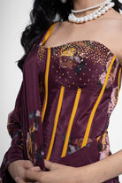 Sarine Corset in pure crepe made on deep maroon base, featuring a tube style corset, with hand embroidery detailing on the cups.