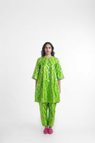 Sunheri Kurta Set In Green has a A Line fit kurta with round neck which has pockets on each side, paired with relaxed fit pyjama, which is elasticated on the waist for added comfort. The set is made in Green Varanasi silk, drawn from our archives. The kurta is highlighted with pearl lace around the neckline and sleeves, and contrasting Pink lining.