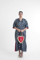 Varga kaftan dress is made in free size, which suits and fits all body type. It has pockets on each side. The dress is made in Black Varanasi silk, drawn from our archives. The Varga Kaftan has stripes banarasi border which cuts the pattern of floral brocade and has a red contrast lining.