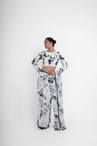 White printed blouse made on crepe base, featuring a high round neck and full sleeves, with hand embroidery detailing all over.