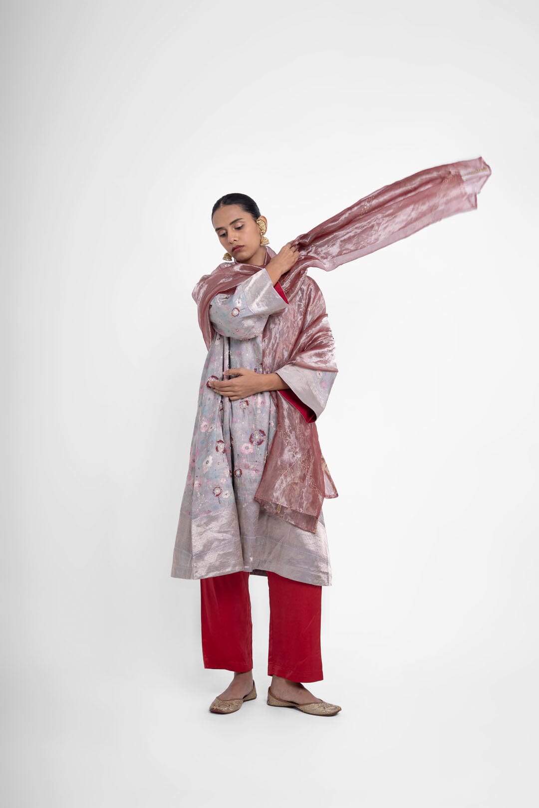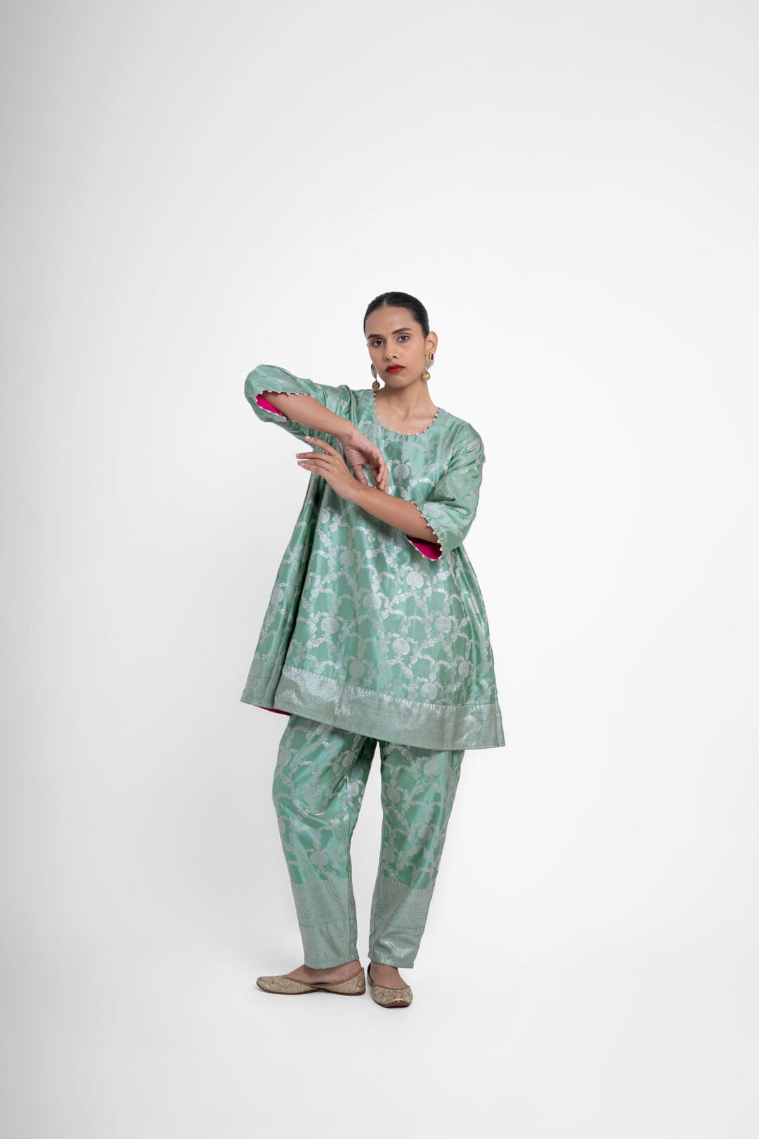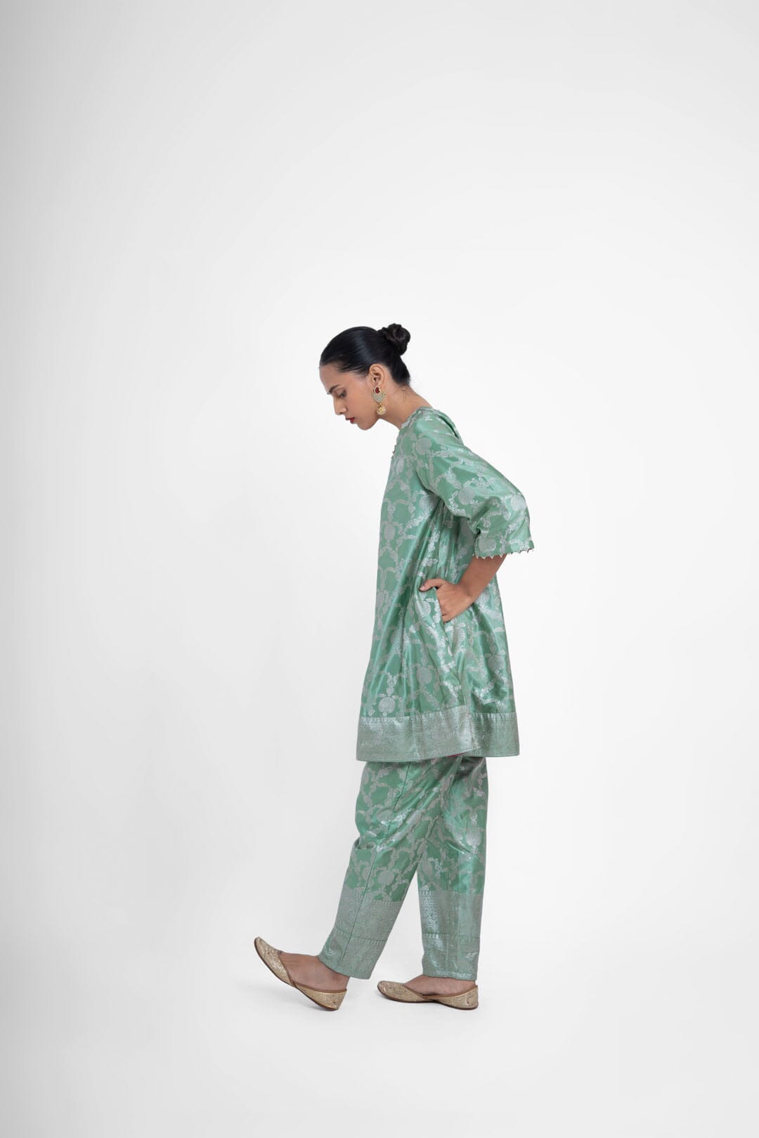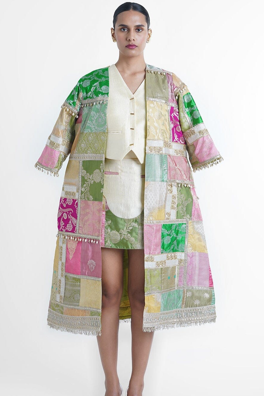Shriya Singhi es una etiqueta de Varanasi. Todas sus piezas están creadas con Banarsi Silk, una fina variante de Silk originaria de la ciudad de Banaras. La elaboración de la seda Banarasi en Shriya Singhi es un hermoso viaje que se desarrolla a medida que los artesanos de Banaras crean la tela desde cero. Cada pieza encargada está meticulosamente hecha a mano creando una pieza única.